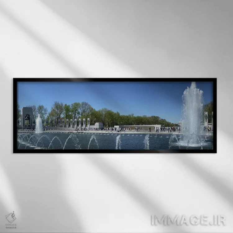 «National World War II Memorial، Washington DC، USA، فواره در بنای یادبود جنگ جهانی دوم، واشنگتن دیسی، آمریکا» اثرِ «پانورامیک ایمجز (استودیو عکاسی عریض)» بازیِ دقیقِ خط و هندسه است؛ پرسپکتیو و خطوط را به مرکز توجه تبدیل کند؛ برای فضاهای اداری انتخابی خوشسلیقه است. برای دیوار گالری هم گزینهٔ خوبیست.