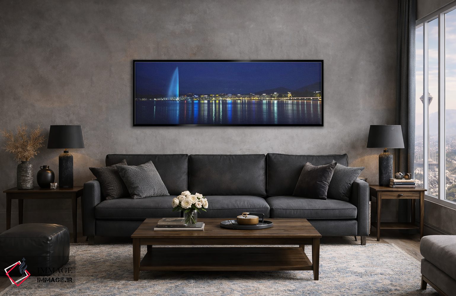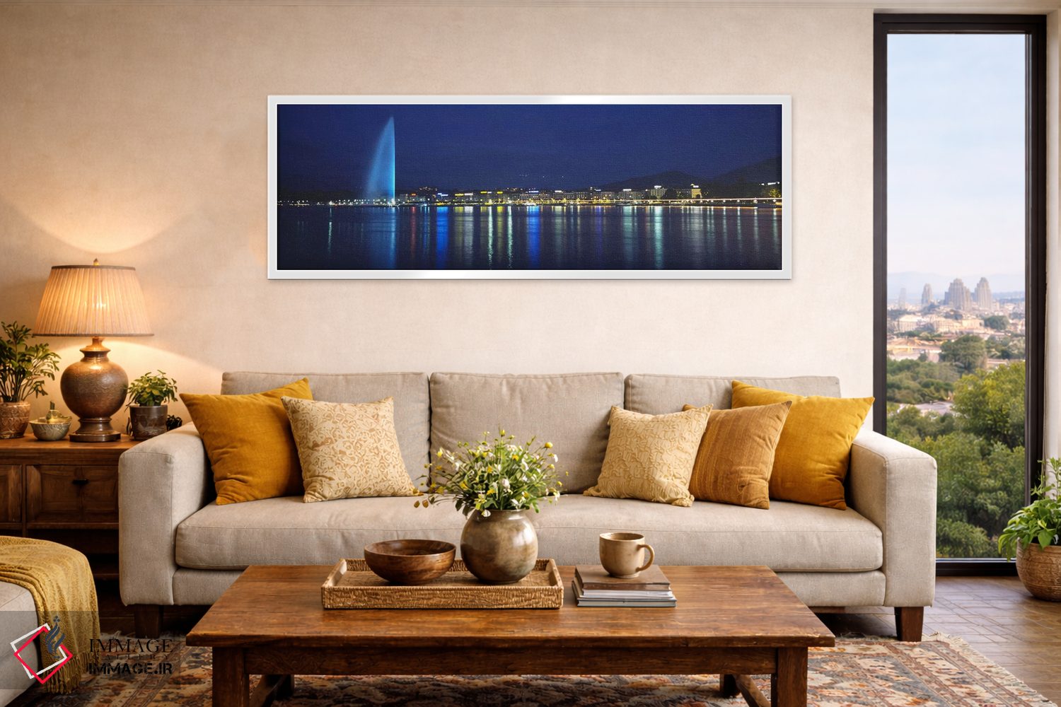 برای دکورهای ساختارمند و مدرن، «Geneva، Switzerland، چشمهٔ جت—دو و ساختمانهای نورانی در امتداد اسکله گوستاو آدور، ژنو، سوئیس» اثرِ «پانورامیک ایمجز (استودیو عکاسی عریض)» پرسپکتیو و خطوط را به مرکز توجه تبدیل کند؛ برای فضاهای اداری انتخابی خوشسلیقه است. فضا را شلوغ نمیکند؛ فقط ساختار میدهد.