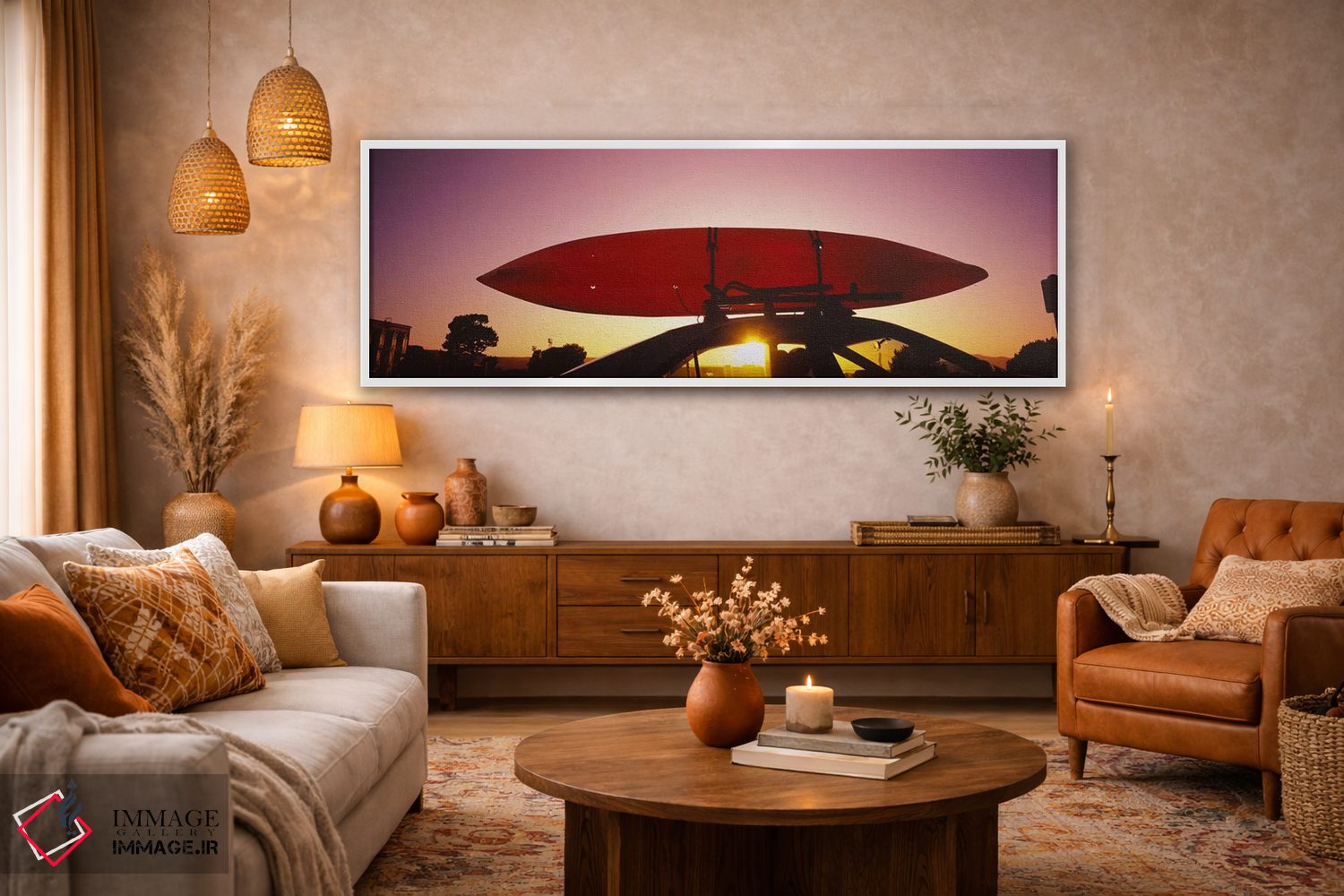 براساس پالت گرم اثر، قاب تیک گرم (چوبی) پیشنهاد اول است و مشکی مات (فریم متوسط) مکمل. برای سفارشهای پروژهای با ابعاد و قابهای اختصاصی با ایماژ در تماس باشید.