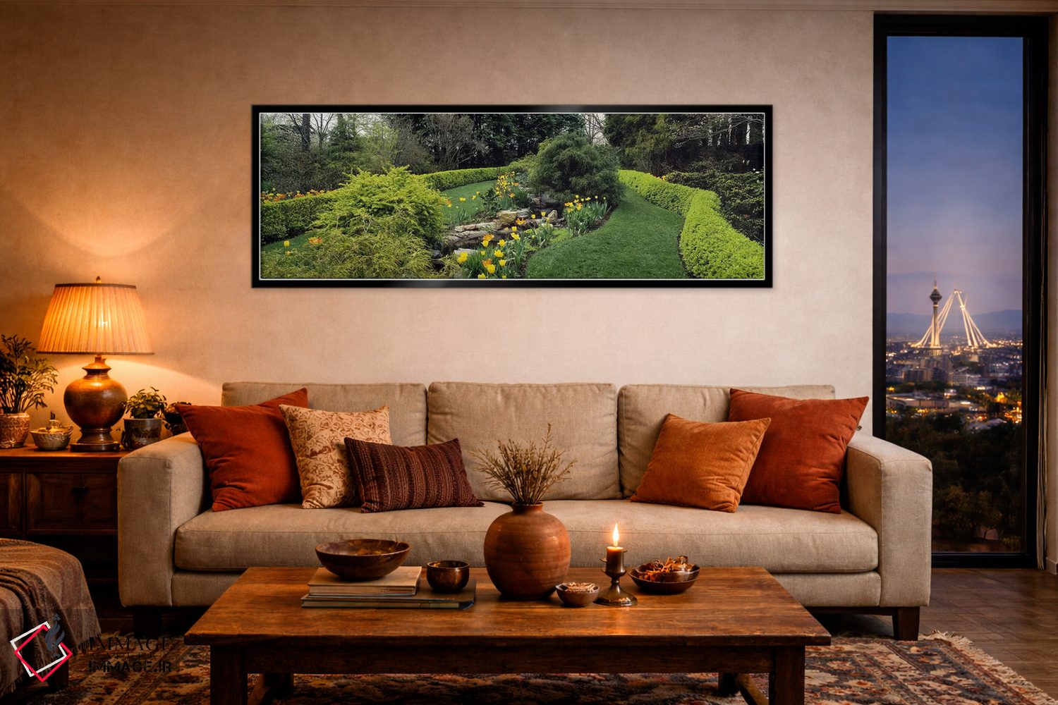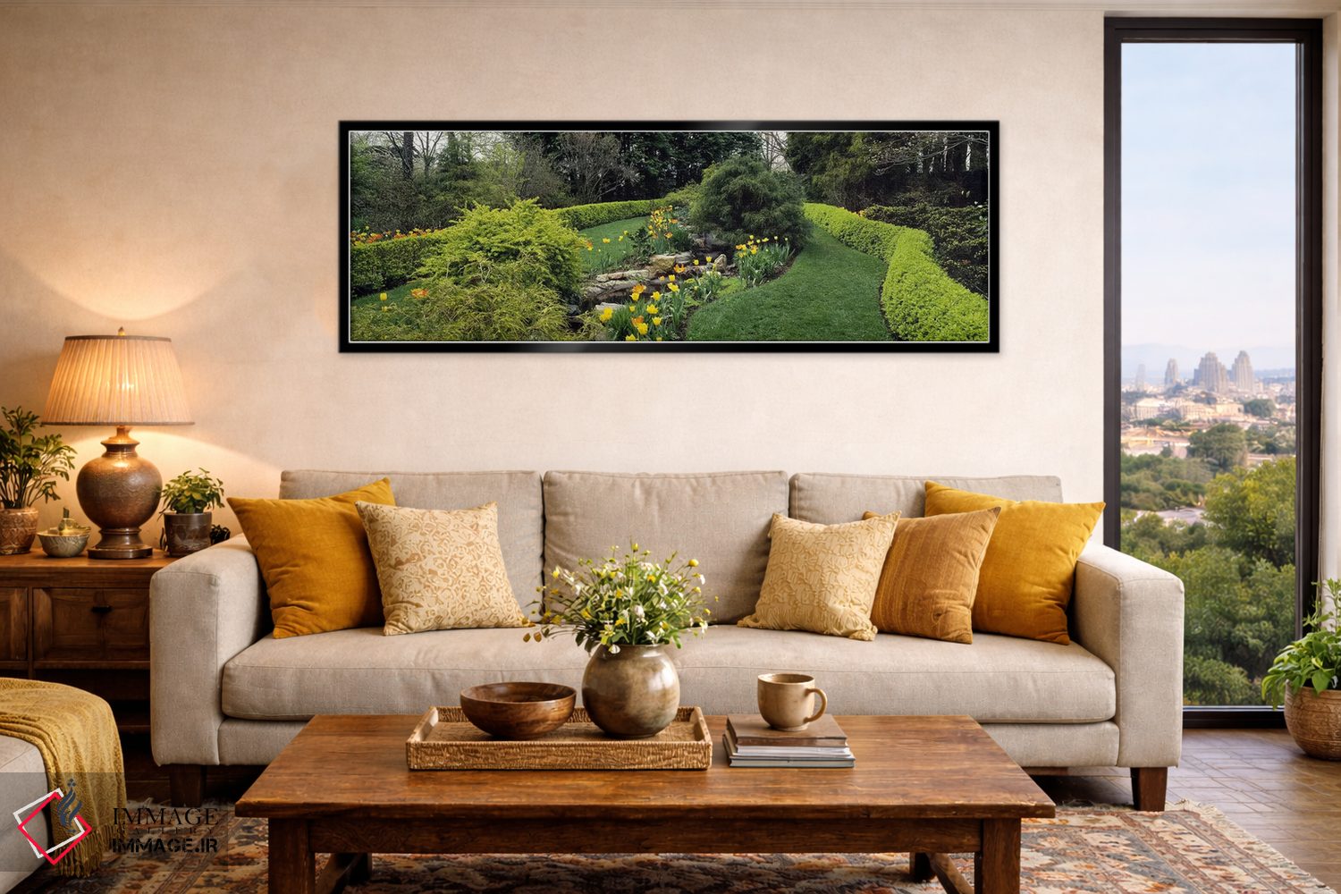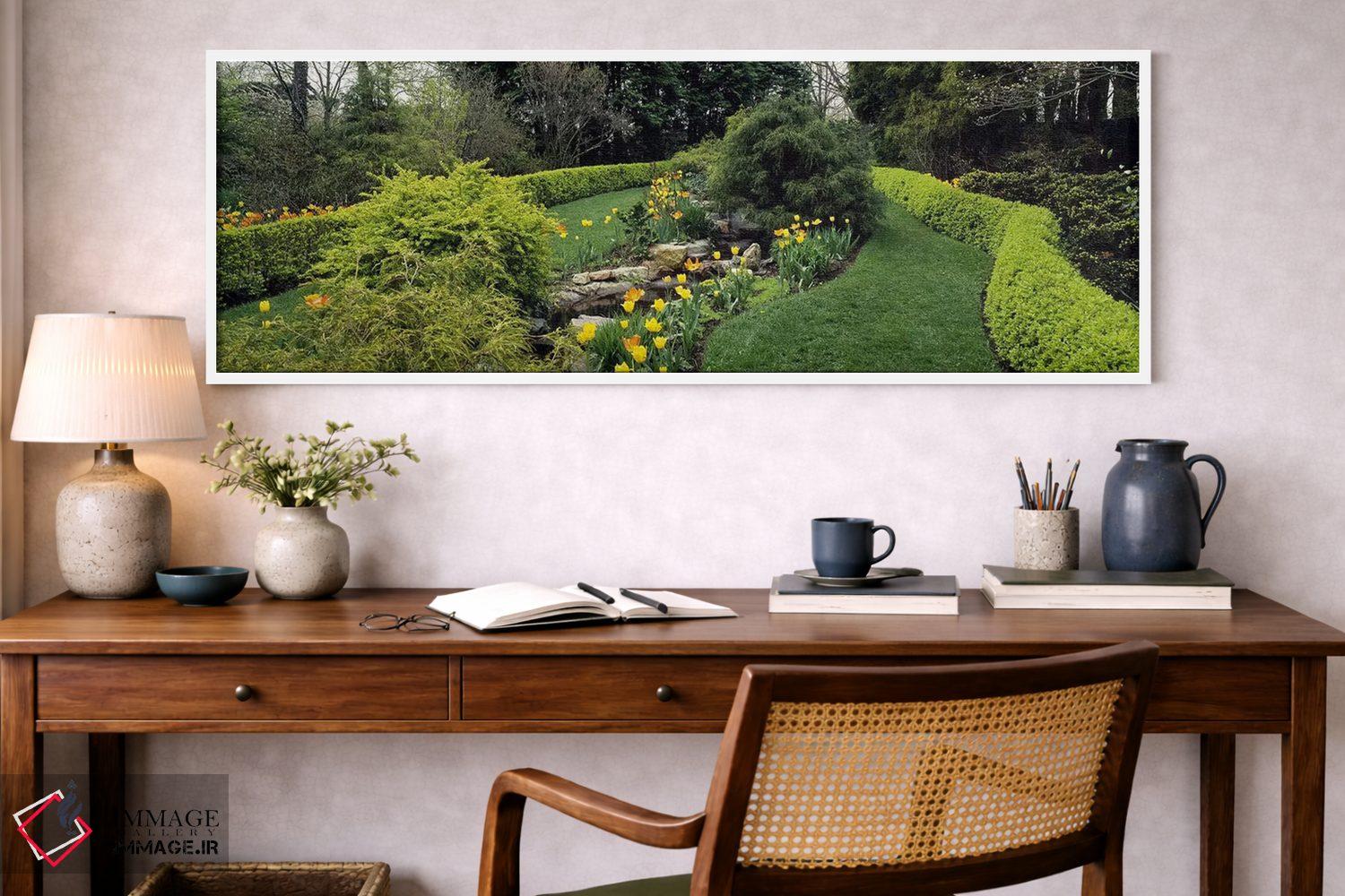 «Monkton، Baltimore County، Maryland، USA، پرچین در باغ رسمی، باغ توپیری لادوو، مانکتون، شهرستان بالتیمور، مریلند، آمریکا» اثرِ «پانورامیک ایمجز (استودیو عکاسی عریض)» از آن انتخابهاییست که به دیوار، شخصیت و جهت میدهد؛ برای دکورهای کلاسیک با چوب و پارچه انتخابی عالی است. فضا را شلوغ نمیکند؛ فقط دقیقترش میکند.