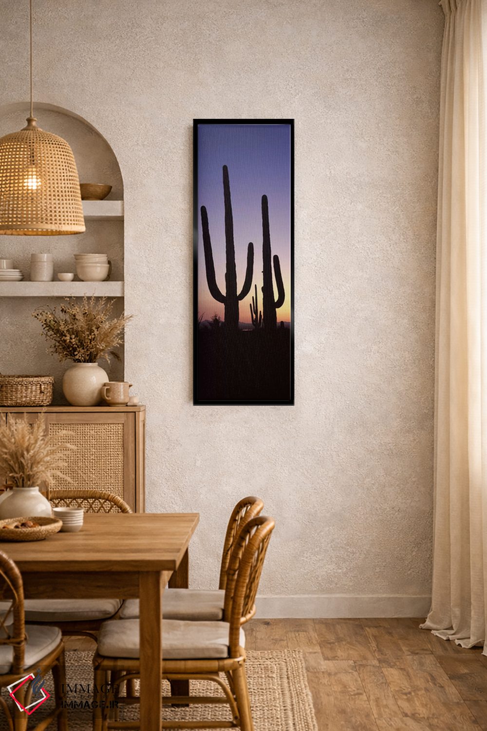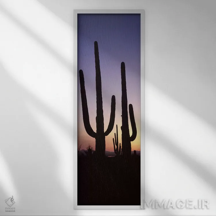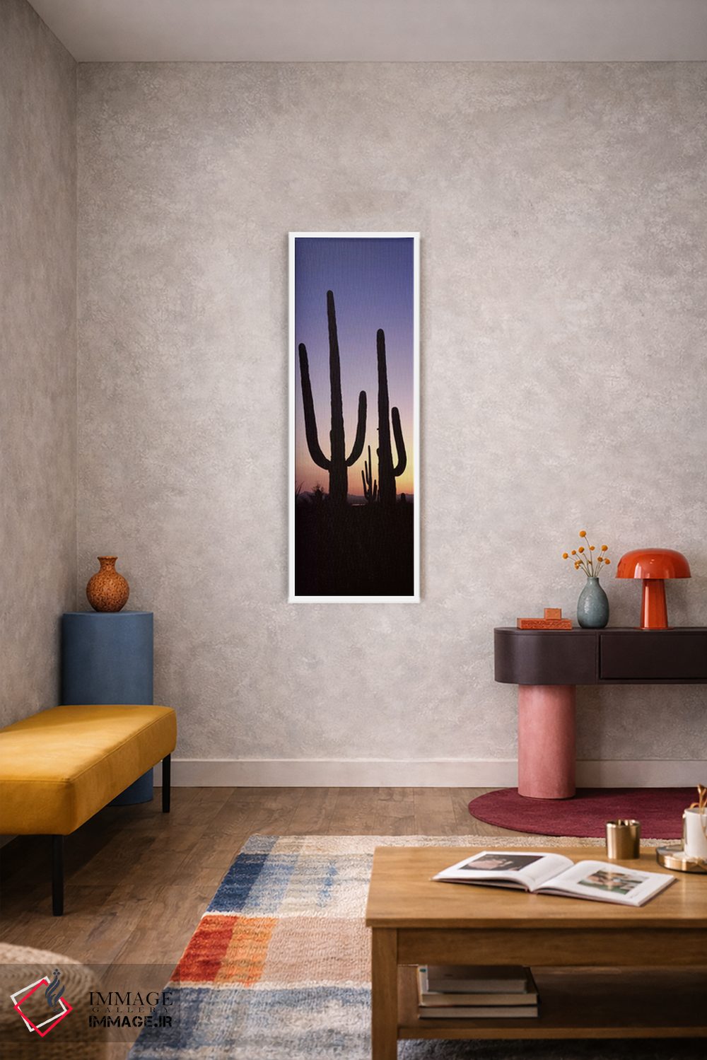 اگر میخواهید دیوار از «پسزمینه» بیرون بیاید، «Saguaro National Park، Tucson، Pima County، Arizona، USA #2، سیلوئت کاکتوسهای ساگوارو (کارنژیا گیگانتهآ) در چشمانداز، پارک ملی ساگوارو، توسان، شهرستان پیما، آریزونا، ایالات متحده آمریکا شماره ۲» اثرِ «پانورامیک ایمجز (استودیو عکاسی عریض)» جلوهٔ رنگها را طبیعیتر و متعادلتر نشان میدهد؛ برای دکورهایی که بافت و جزئیات در آن مهم است پیشنهاد میشود. جزئیاتش نزدیکِ کار هم ارزش نگاه دارد.