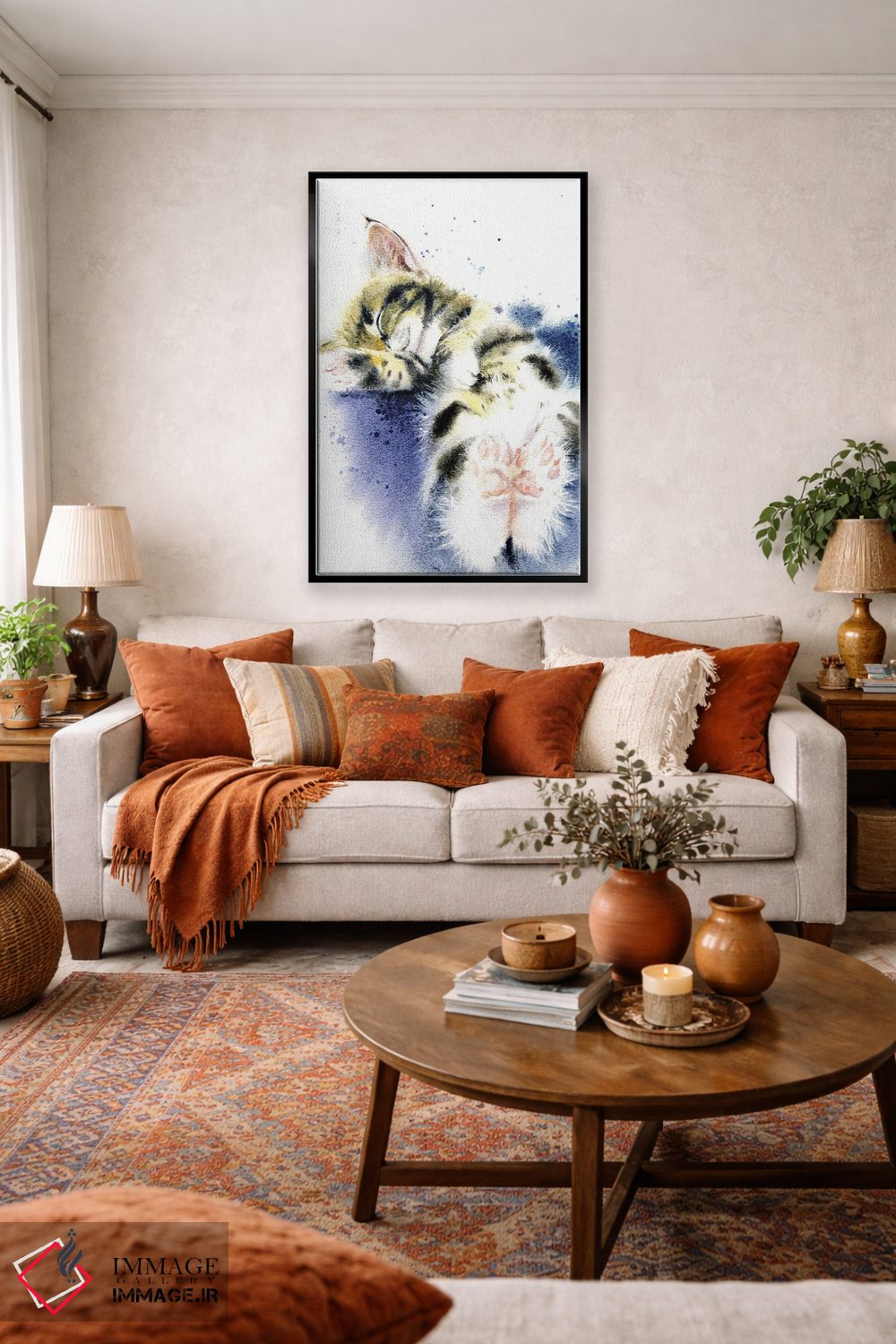 براساس پالت ترکیبی اثر، قاب تیک گرم (چوبی) پیشنهاد اول است و مشکی مات (فریم متوسط) مکمل. برای سفارشهای پروژهای با ابعاد و قابهای اختصاصی با ایماژ در تماس باشید.