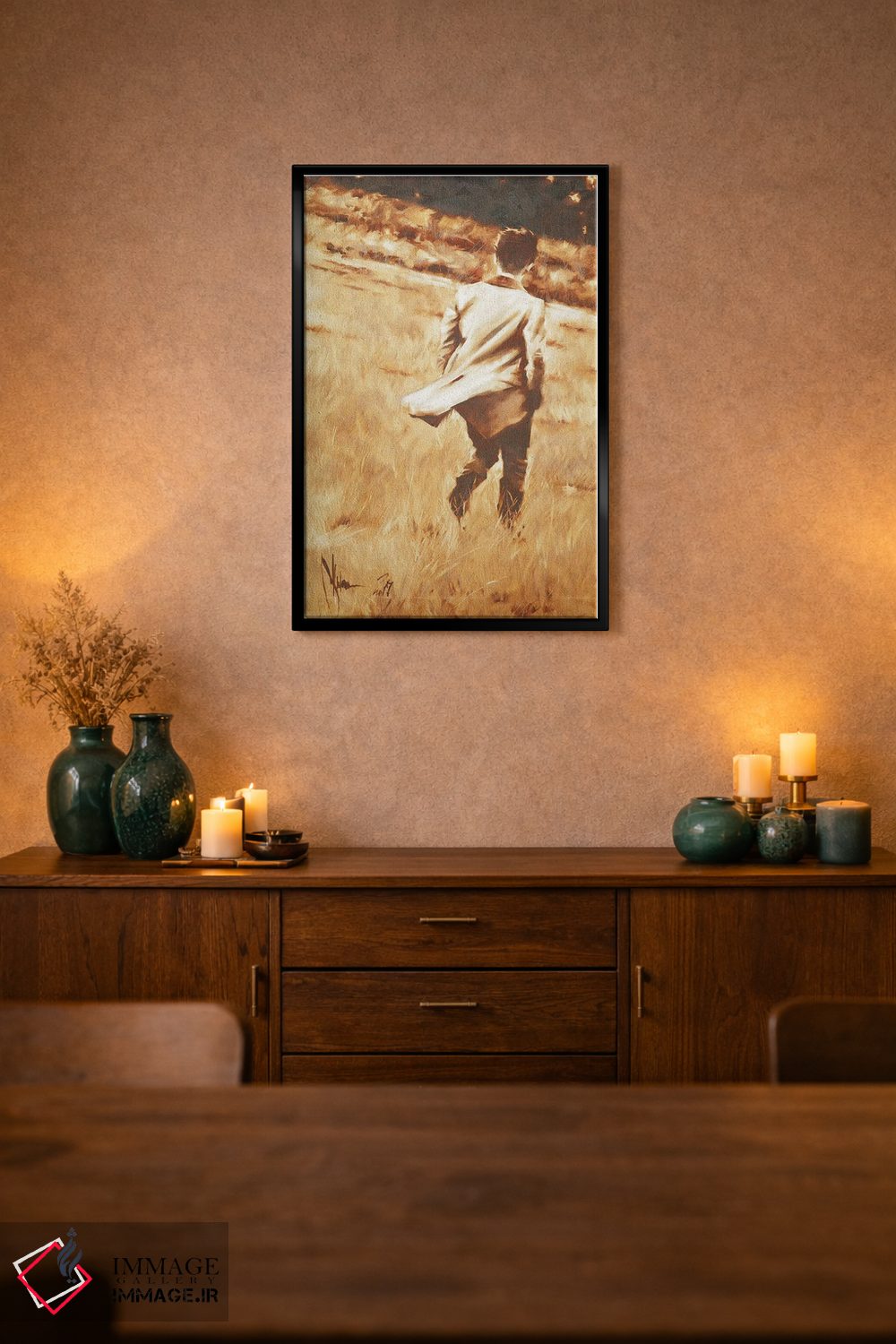 براساس پالت گرم اثر، قاب تیک گرم (چوبی) پیشنهاد اول است و مشکی مات (فریم متوسط) مکمل. برای سفارشهای پروژهای با ابعاد و قابهای اختصاصی با ایماژ در تماس باشید.