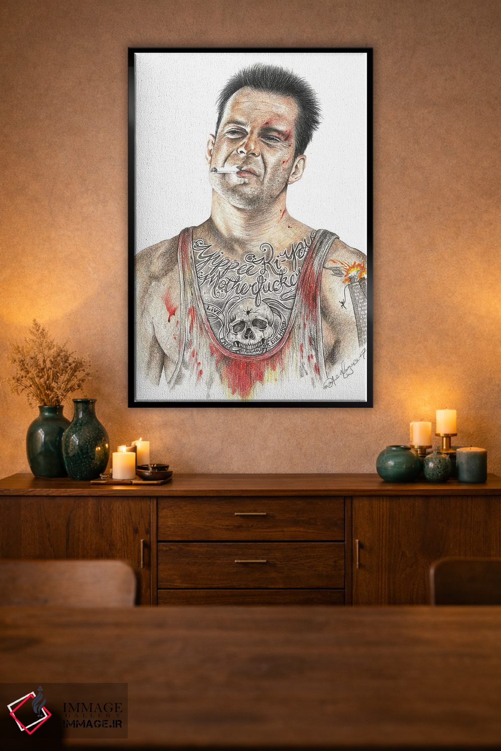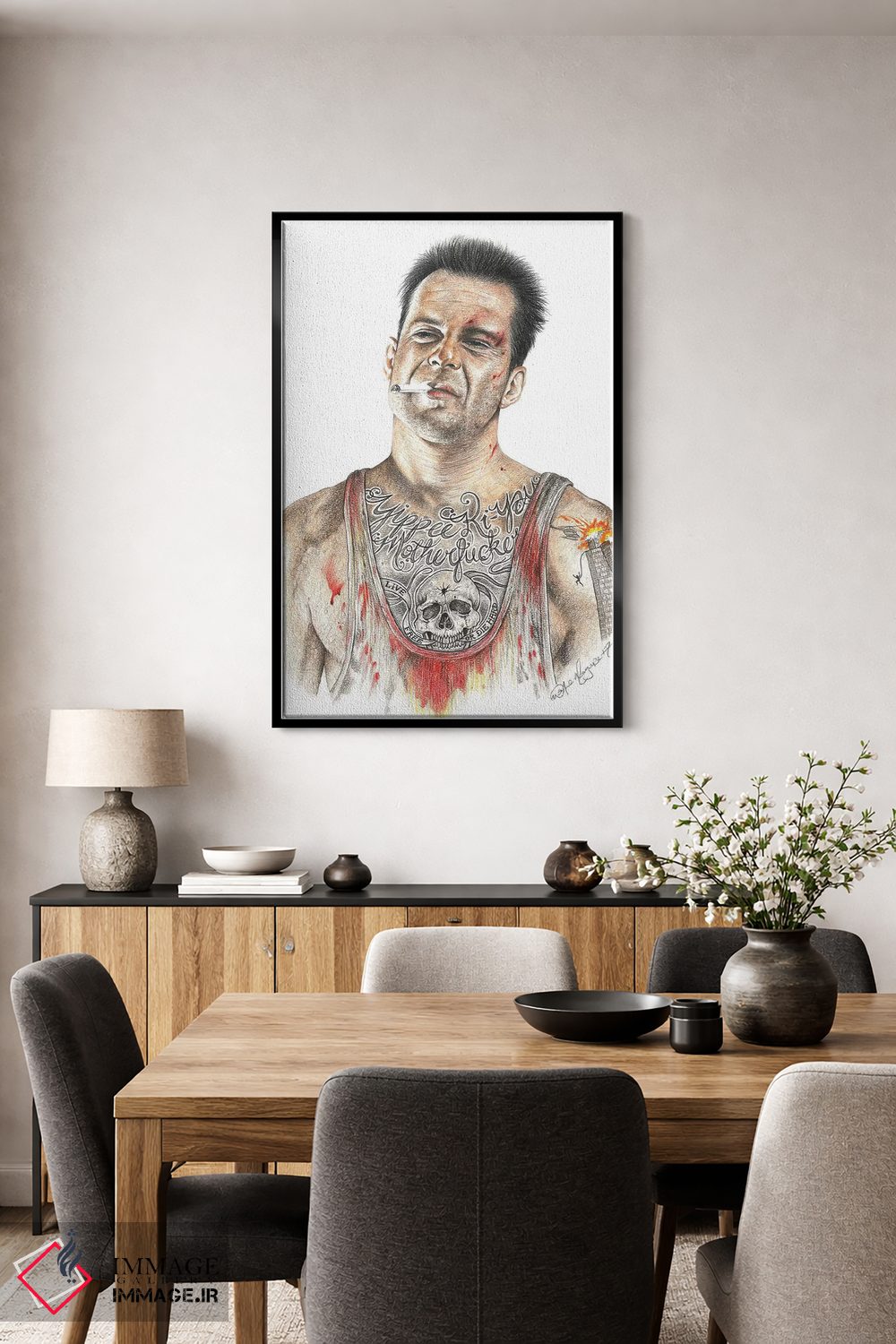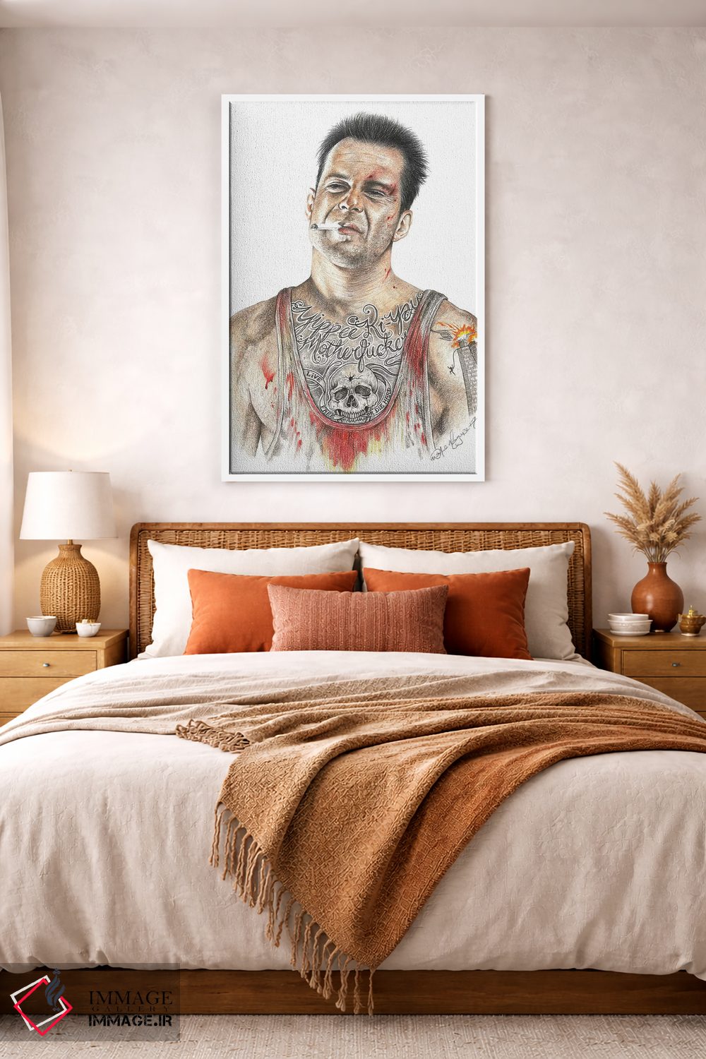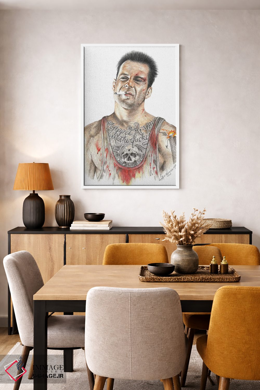 براساس پالت گرم اثر، قاب بلوط روشن (چوبی) پیشنهاد اول است و استخوانی ملایم مکمل. برای سفارشهای پروژهای با ابعاد و قابهای اختصاصی با ایماژ در تماس باشید.