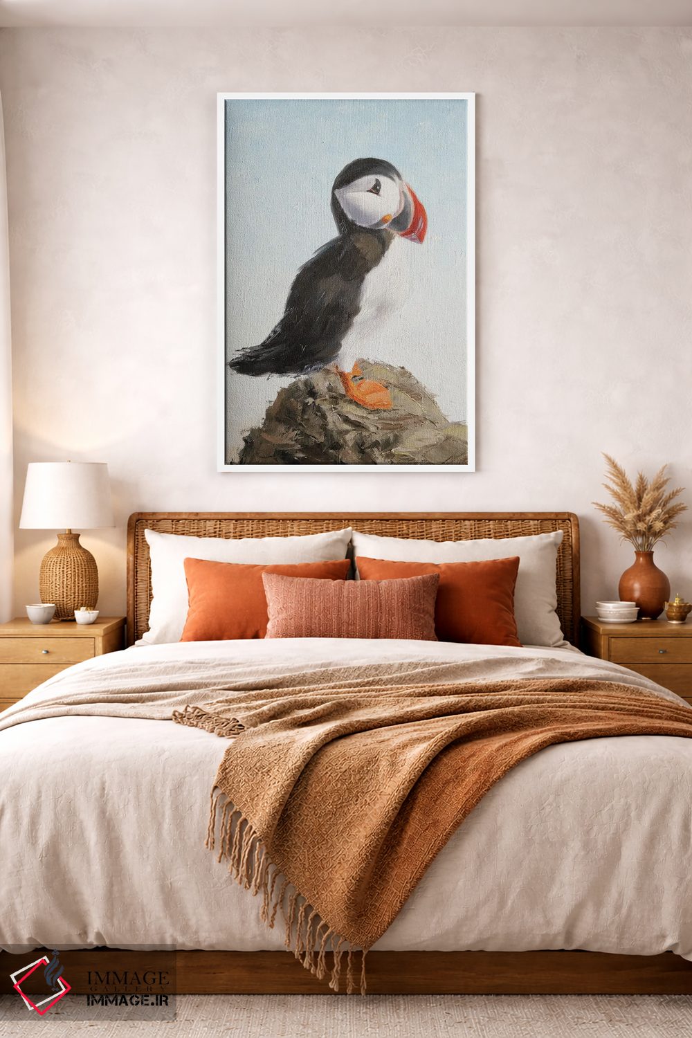 براساس پالت گرم اثر، قاب بلوط روشن (چوبی) پیشنهاد اول است و استخوانی ملایم مکمل. برای سفارشهای پروژهای با ابعاد و قابهای اختصاصی با ایماژ در تماس باشید.