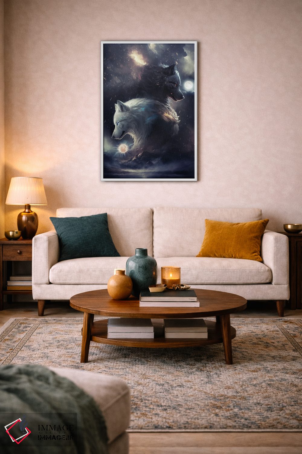 اگر میخواهید دیوار کمی سرزندگیِ محترمانه داشته باشد، «اسکول و هاتی (گرگهای افسانه نورس)» اثرِ «ایکارونا (برند هنری/استودیو)» بدون کودکانه شدن، بازیگوش و خوشپرداخت میماند، برای اتاق کودک (بدون لحن کودکانه) گزینهٔ مناسبیست. برای دیوار گالریوار هم گزینهٔ خوبیست.