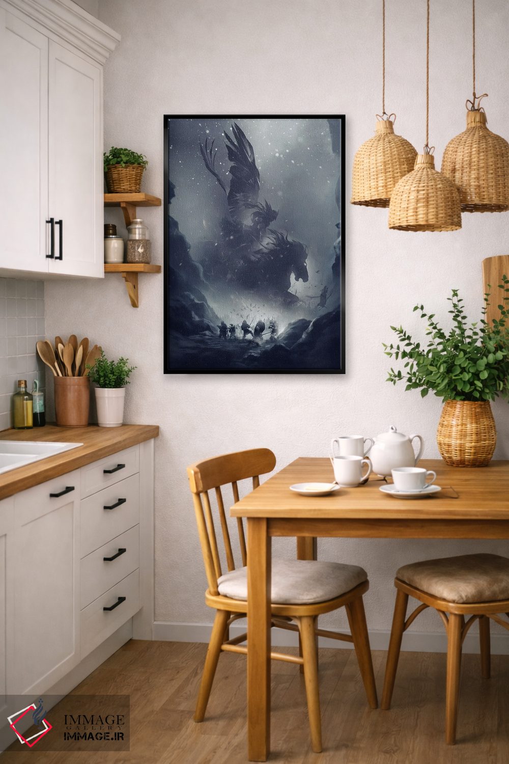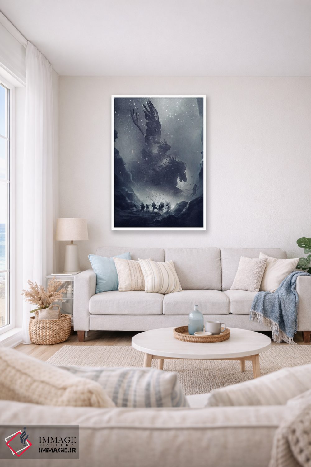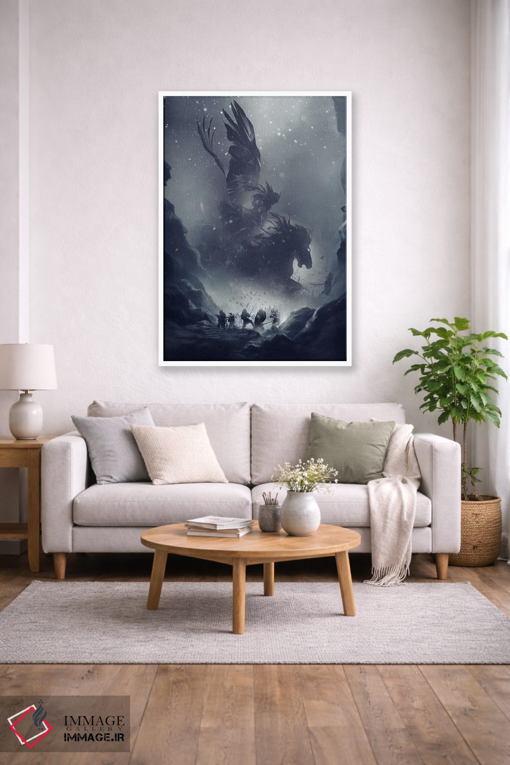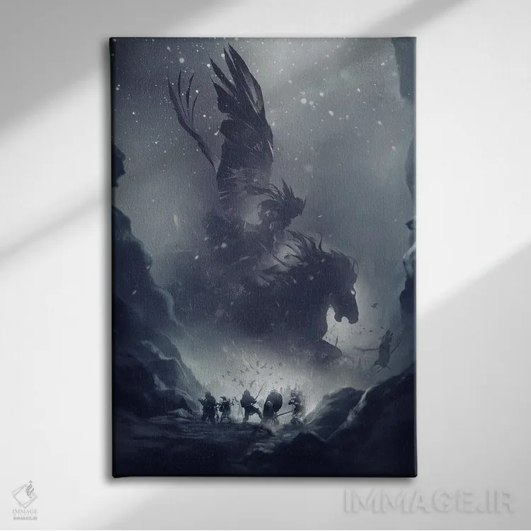 «سواری والکریها (افسانه نورس)» اثرِ «ایکارونا (برند هنری/استودیو)» یک لهجهی مدرن برای ترکیبهای خاکستری/سفید و نور سرد است.