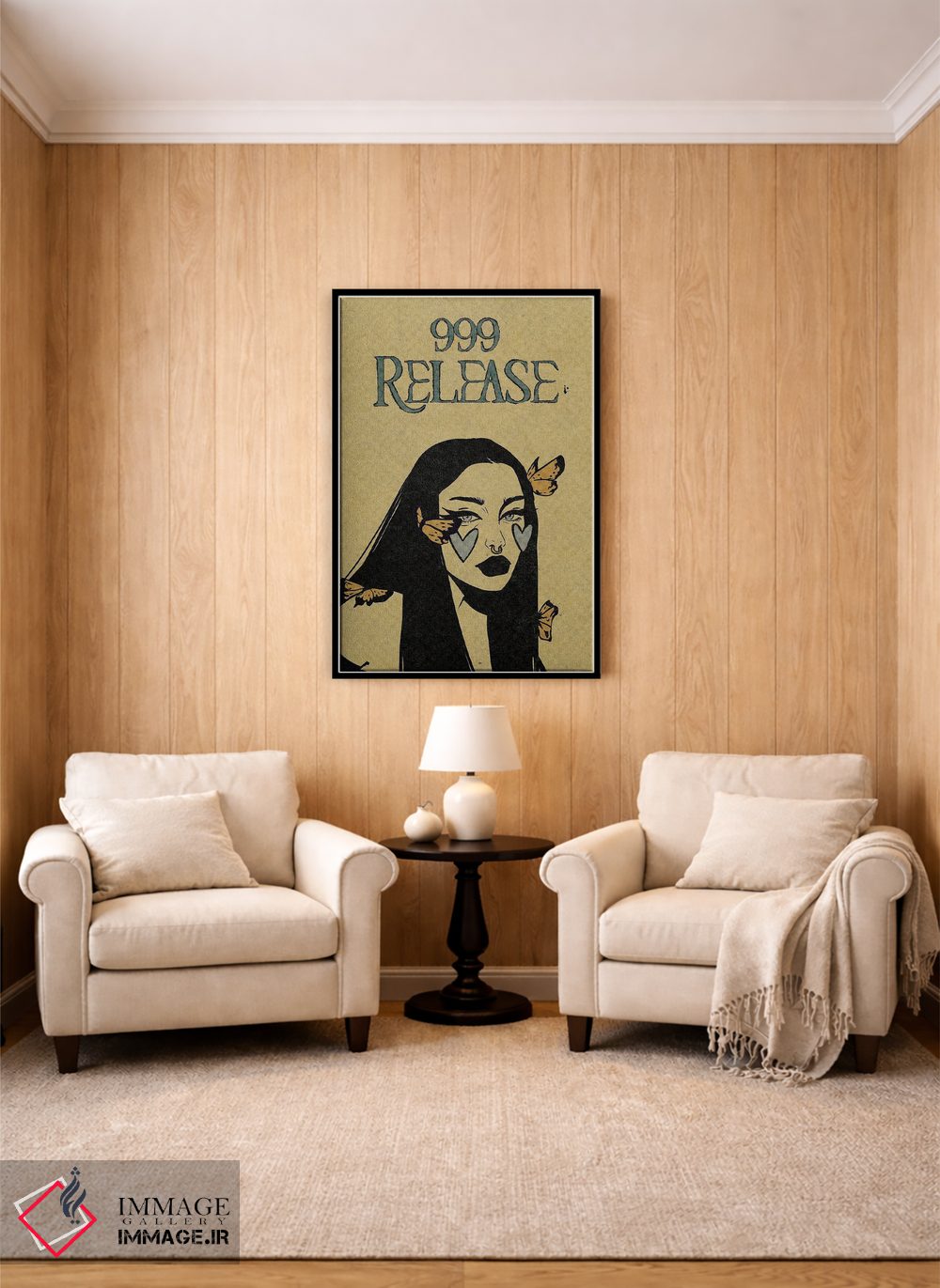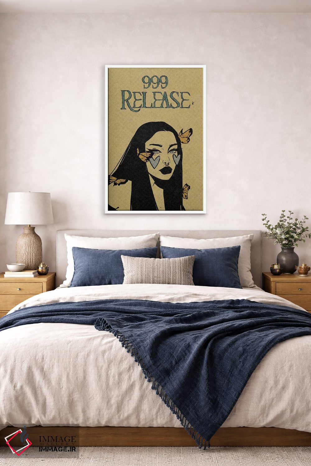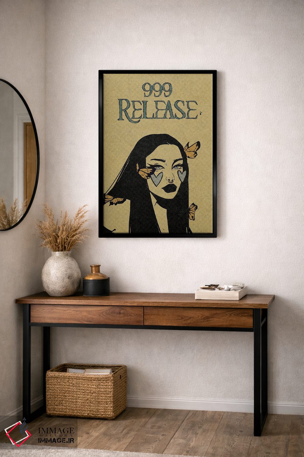 براساس پالت گرم اثر، قاب بلوط روشن (چوبی) پیشنهاد اول است و استخوانی ملایم مکمل. برای سفارشهای پروژهای با ابعاد و قابهای اختصاصی با ایماژ در تماس باشید.