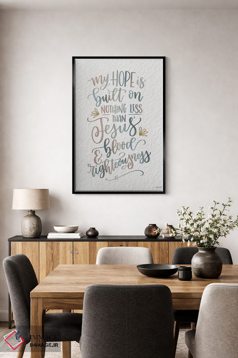 براساس پالت خنثی اثر، قاب مشکی مات (فریم باریک) پیشنهاد اول است و سفید مات (فریم باریک) مکمل. برای سفارشهای پروژهای با ابعاد و قابهای اختصاصی با ایماژ در تماس باشید.