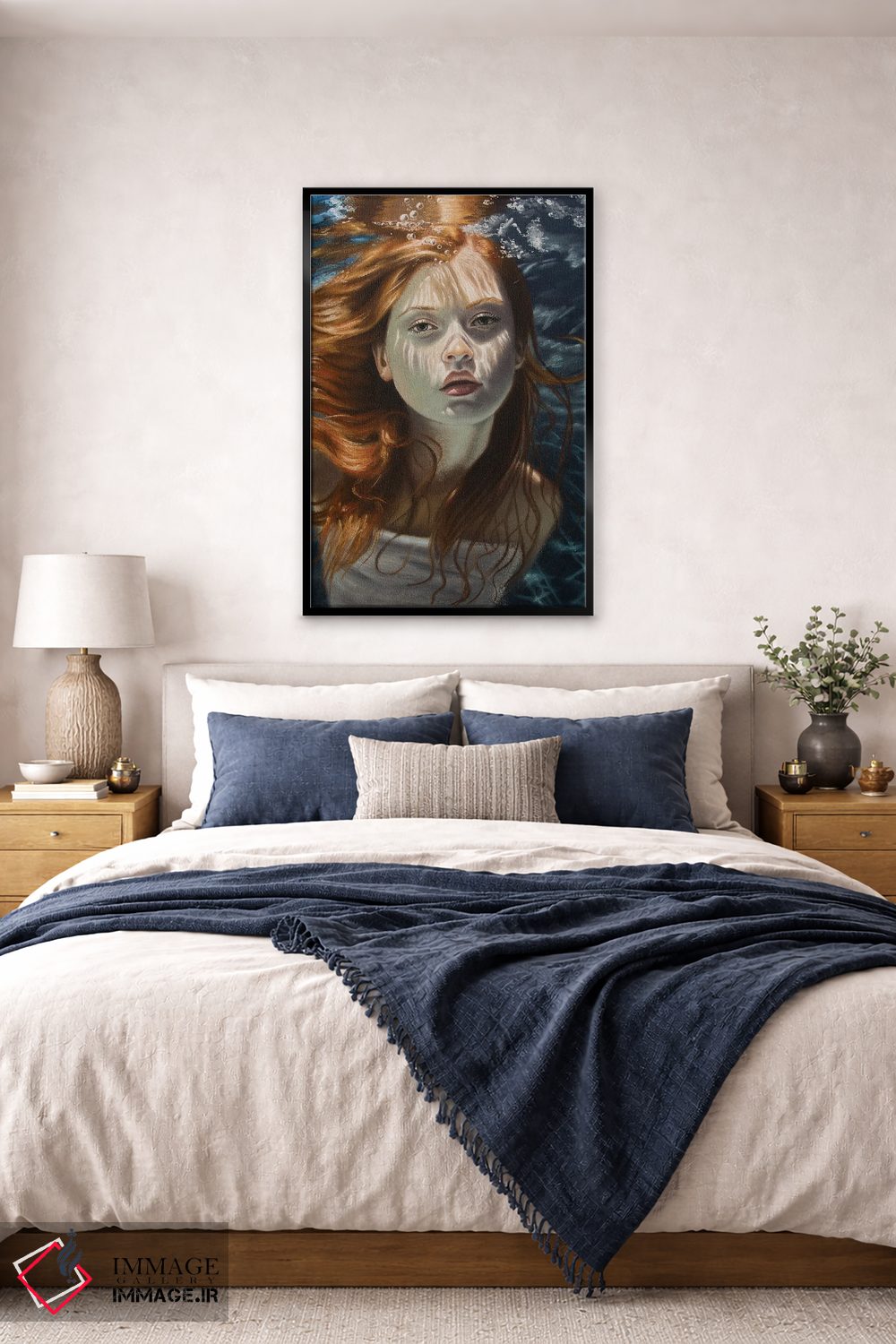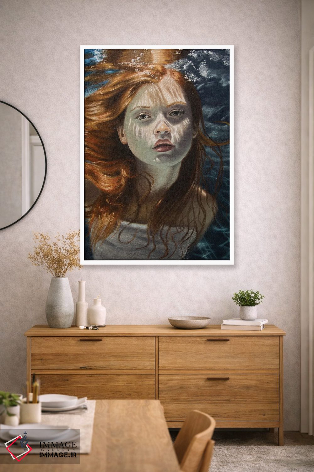 براساس پالت گرم اثر، قاب بلوط روشن (چوبی) پیشنهاد اول است و استخوانی ملایم مکمل. برای سفارشهای پروژهای با ابعاد و قابهای اختصاصی با ایماژ در تماس باشید.