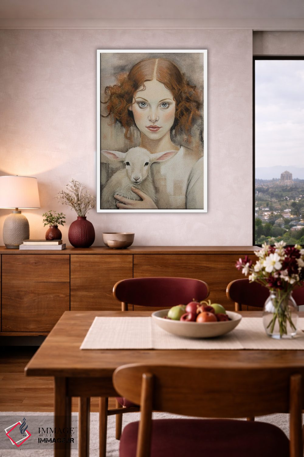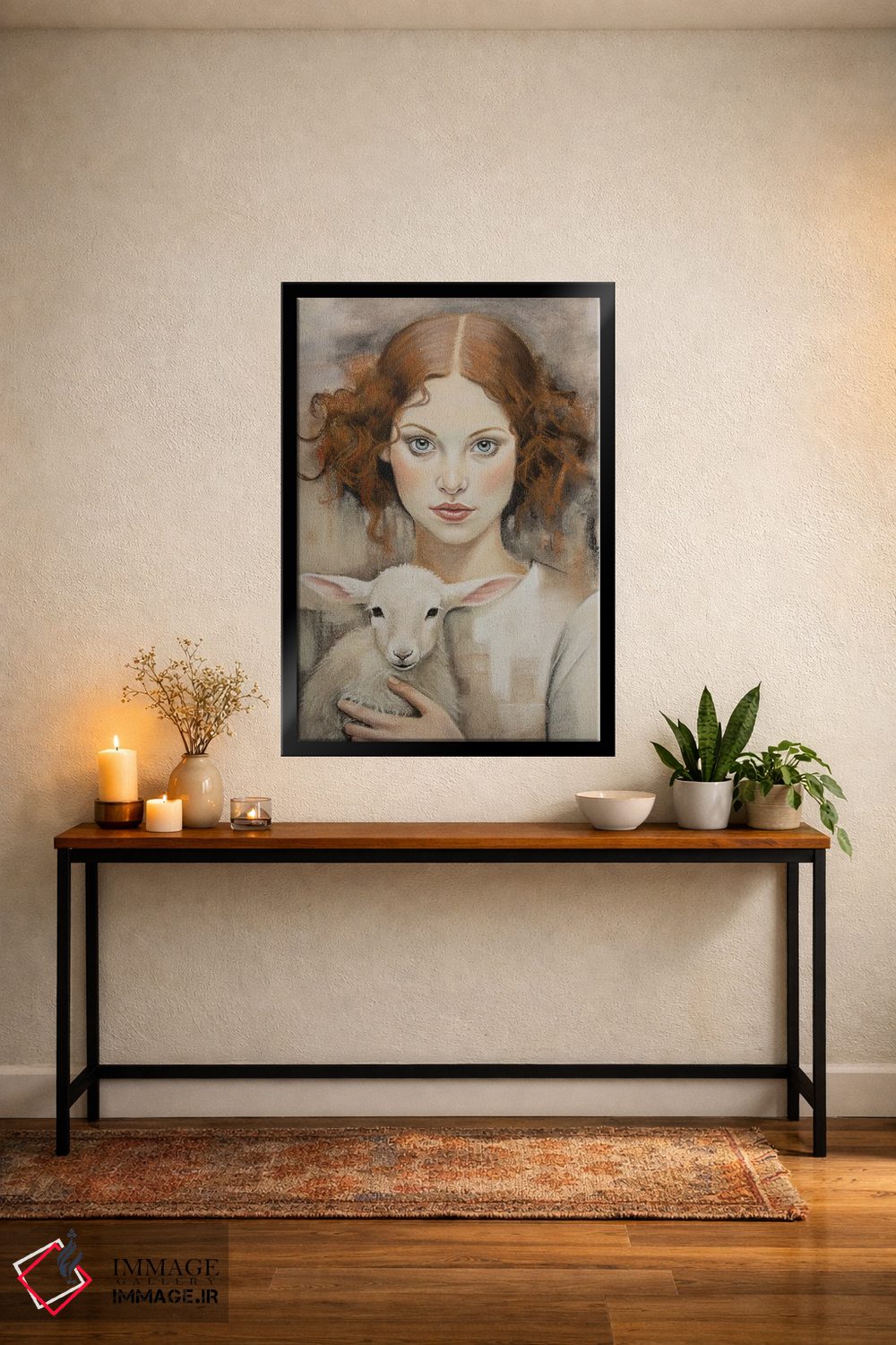 اگر میخواهید دیوار کمی سرزندگیِ محترمانه داشته باشد، «دختری با بره» اثرِ «اینا مدودِوا» به فضا، گرمیِ ملایم اضافه میکند، برای دکورهایی با رنگهای خنثی گزینهٔ مناسبیست. هر بار نگاهش میکنید، یک جزئیات تازه به چشم میآید.