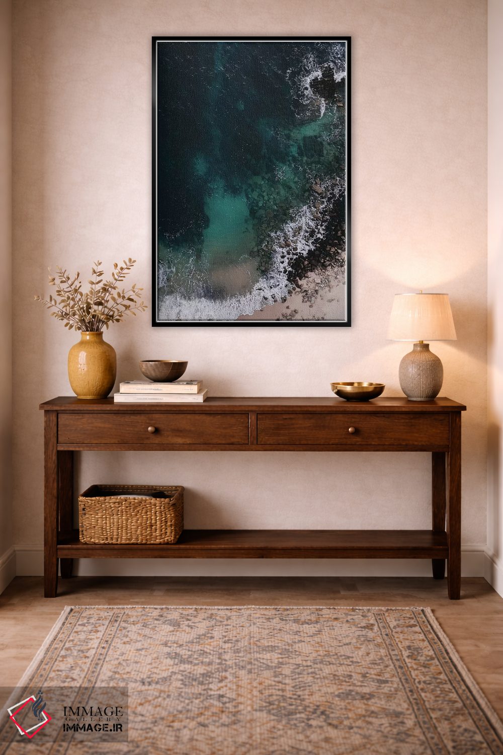 این اثرِ «اینگرید بدوز» در حالوهوای ساحلی، برای کنار چوب روشن و دیوارهای سفید/کرم یک انتخاب خوشنشین است؛ موضوعِ این اثر هم حسِ سفر میآورد.