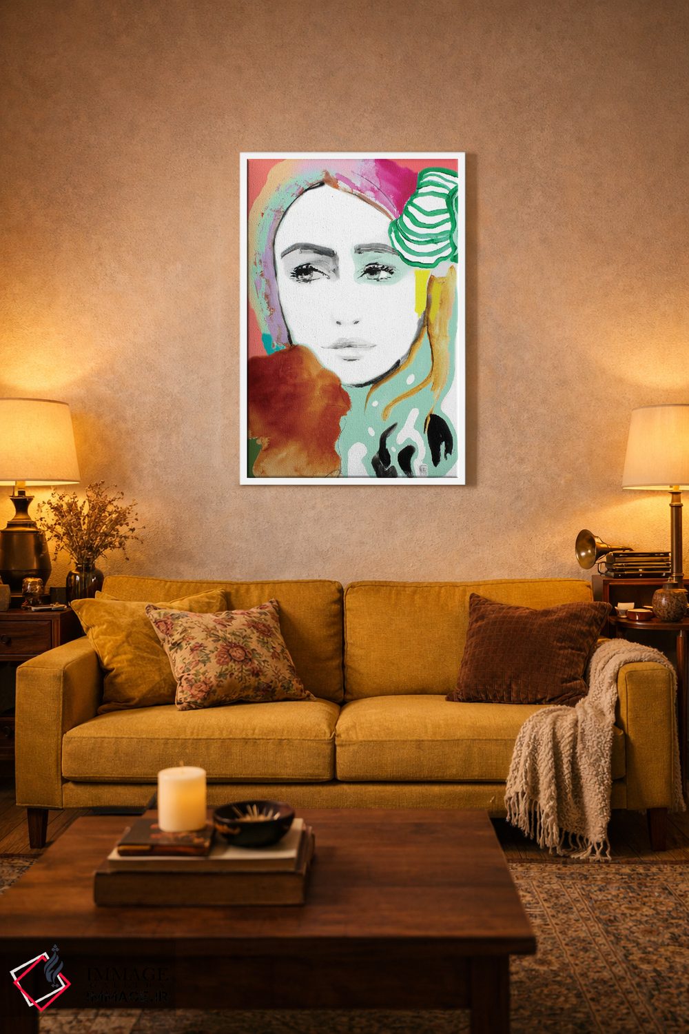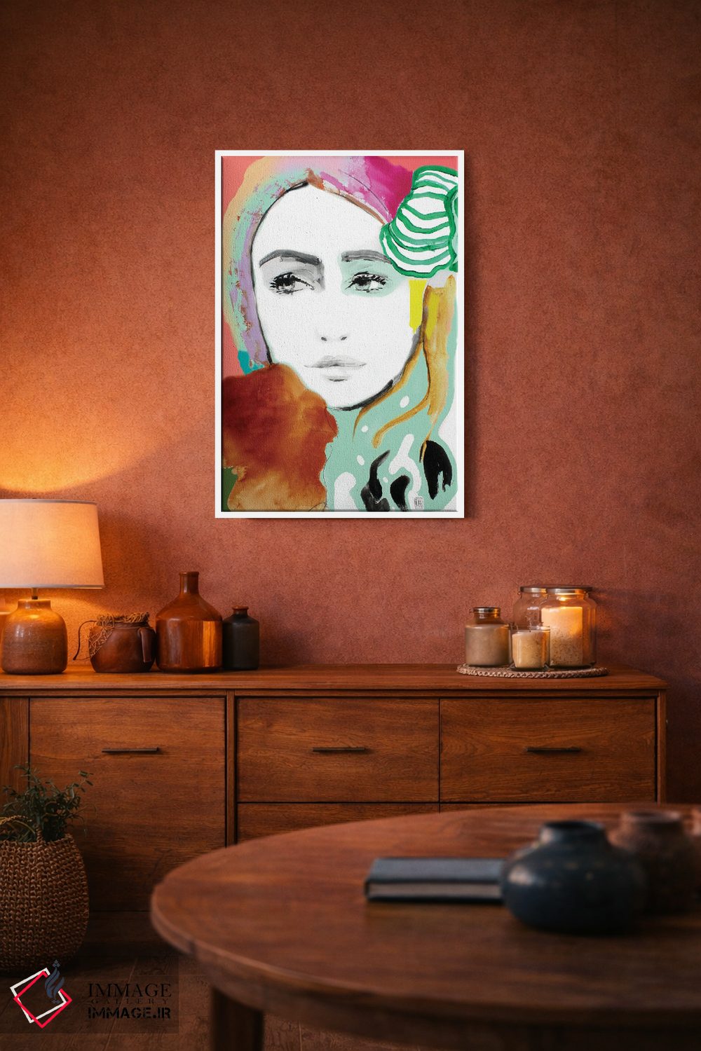 براساس پالت ترکیبی اثر، قاب تیک گرم (چوبی) پیشنهاد اول است و مشکی مات (فریم متوسط) مکمل. برای سفارشهای پروژهای با ابعاد و قابهای اختصاصی با ایماژ در تماس باشید.