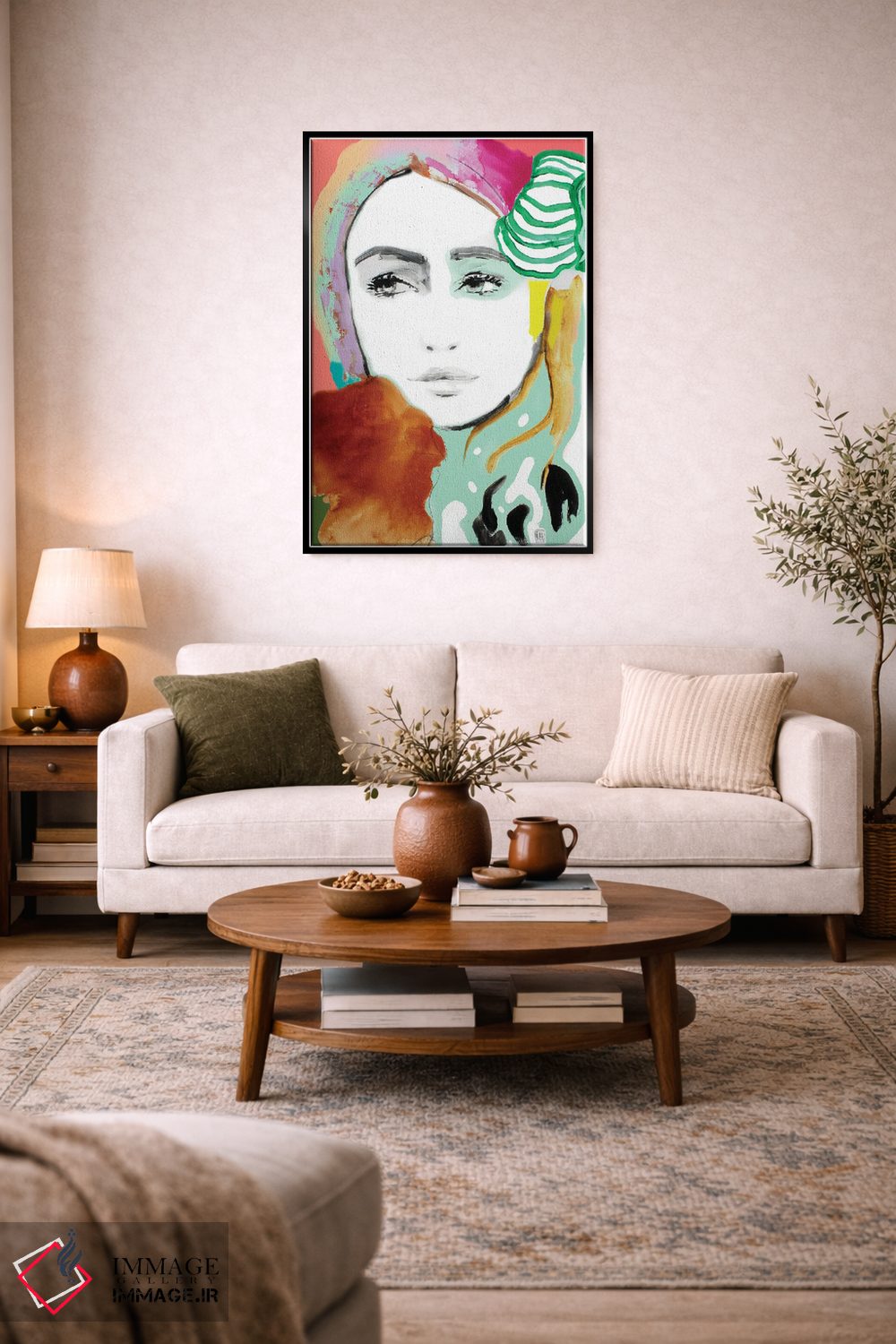 این تابلو اثرِ «استودیو پِینت—اینگ» با حس معاصر، کنار رنگهای خنثی و مبلمان ساده خوب مینشیند؛ موضوعِ این اثر هم فضا را کامل میکند.