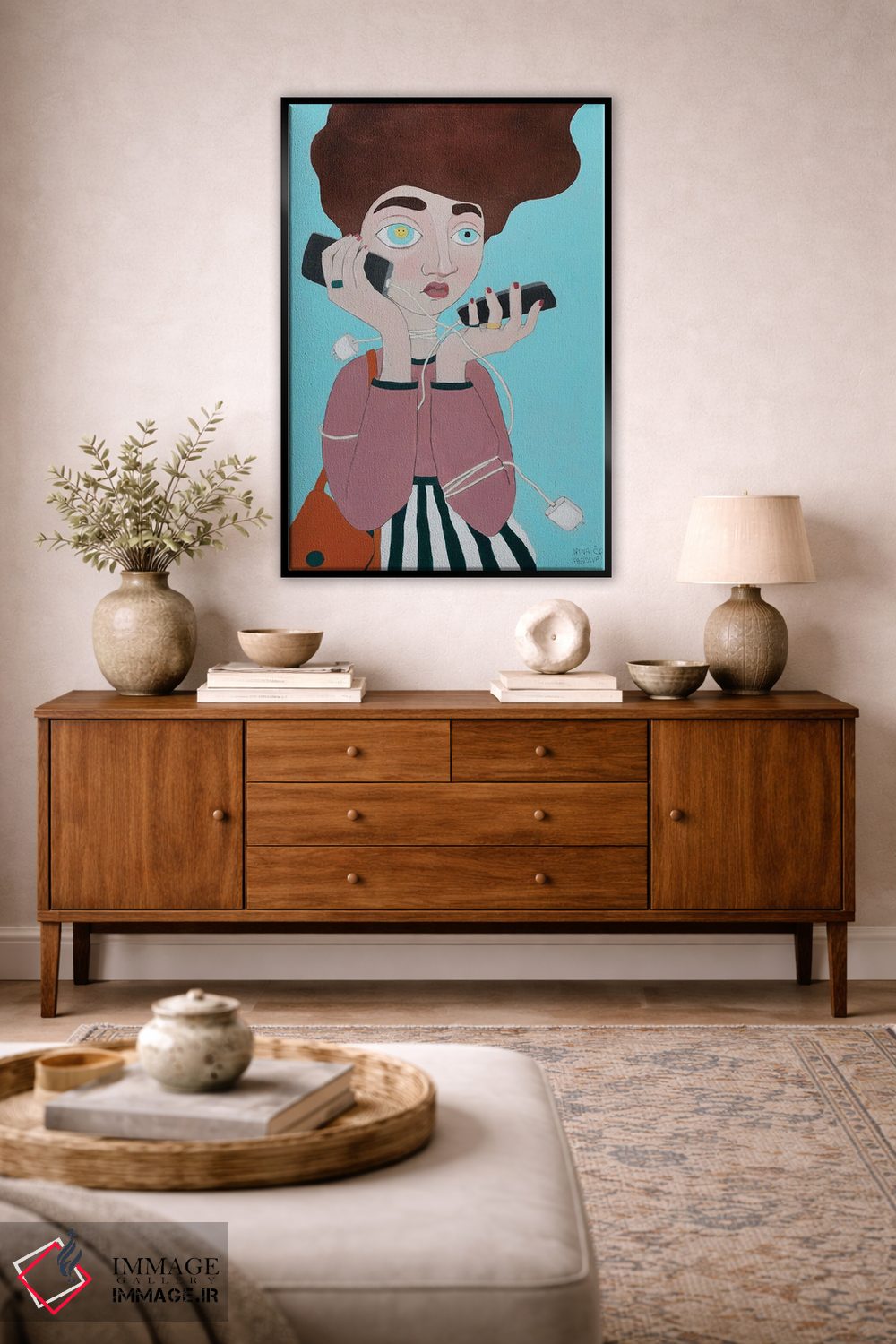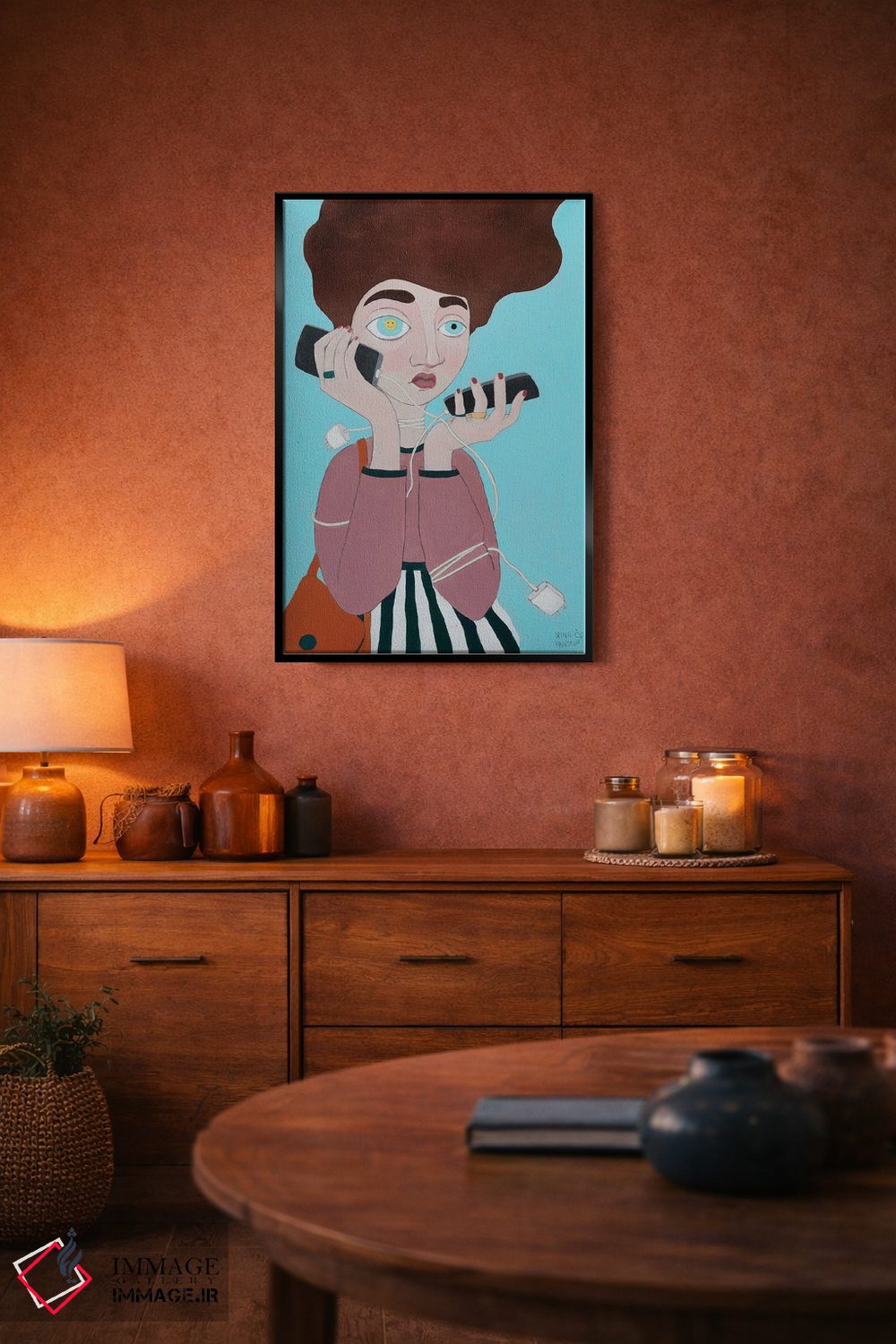 براساس پالت ترکیبی اثر، قاب تیک گرم (چوبی) پیشنهاد اول است و مشکی مات (فریم متوسط) مکمل. برای سفارشهای پروژهای با ابعاد و قابهای اختصاصی با ایماژ در تماس باشید.