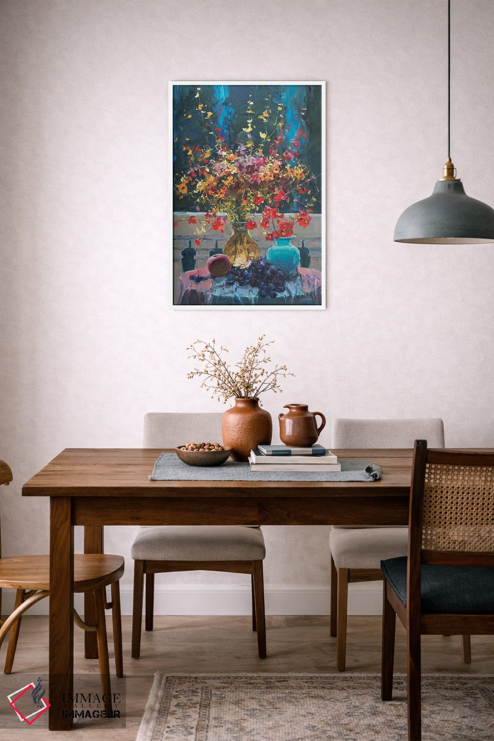 براساس پالت ترکیبی اثر، قاب تیک گرم (چوبی) پیشنهاد اول است و مشکی مات (فریم متوسط) مکمل. برای سفارشهای پروژهای با ابعاد و قابهای اختصاصی با ایماژ در تماس باشید.