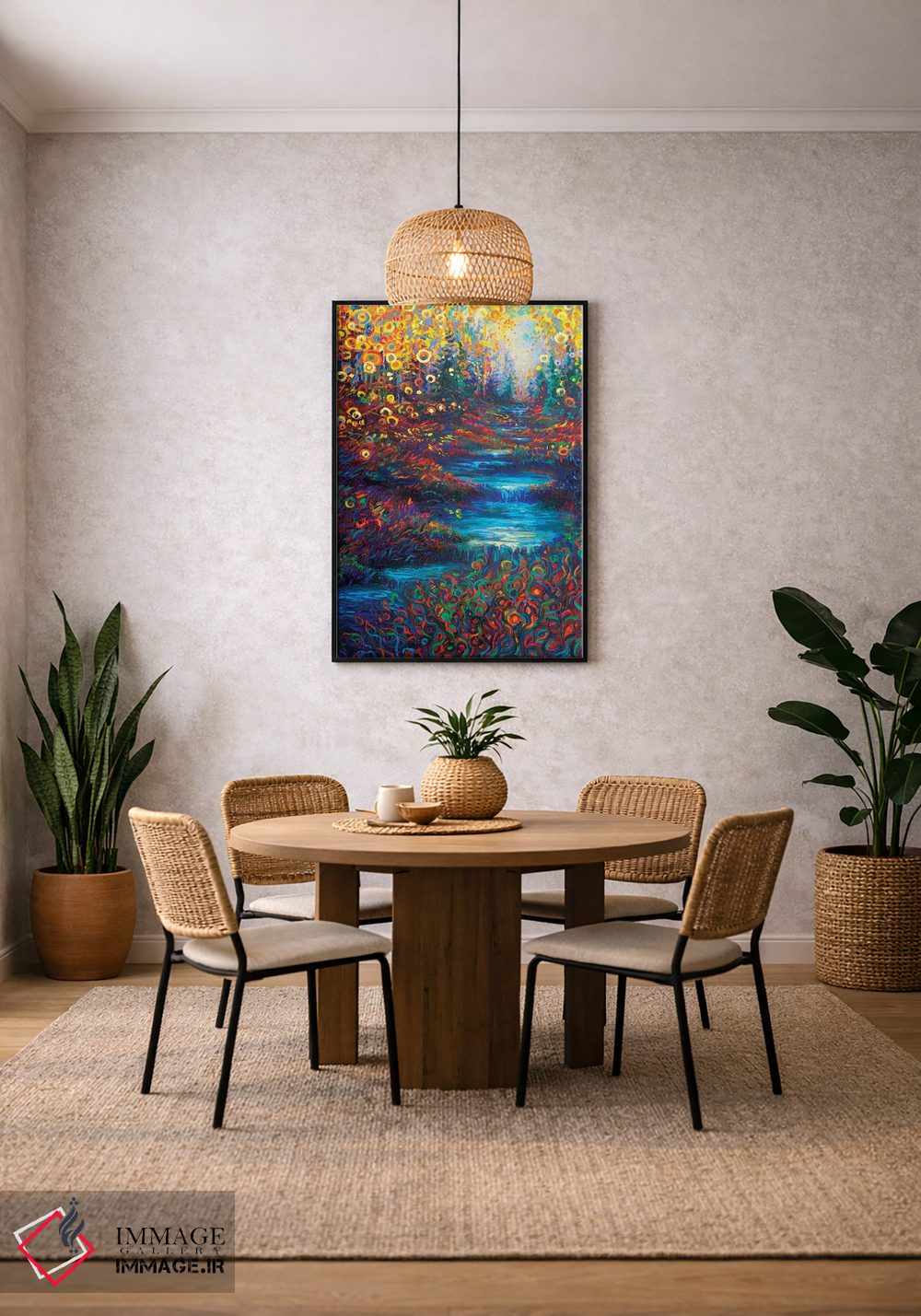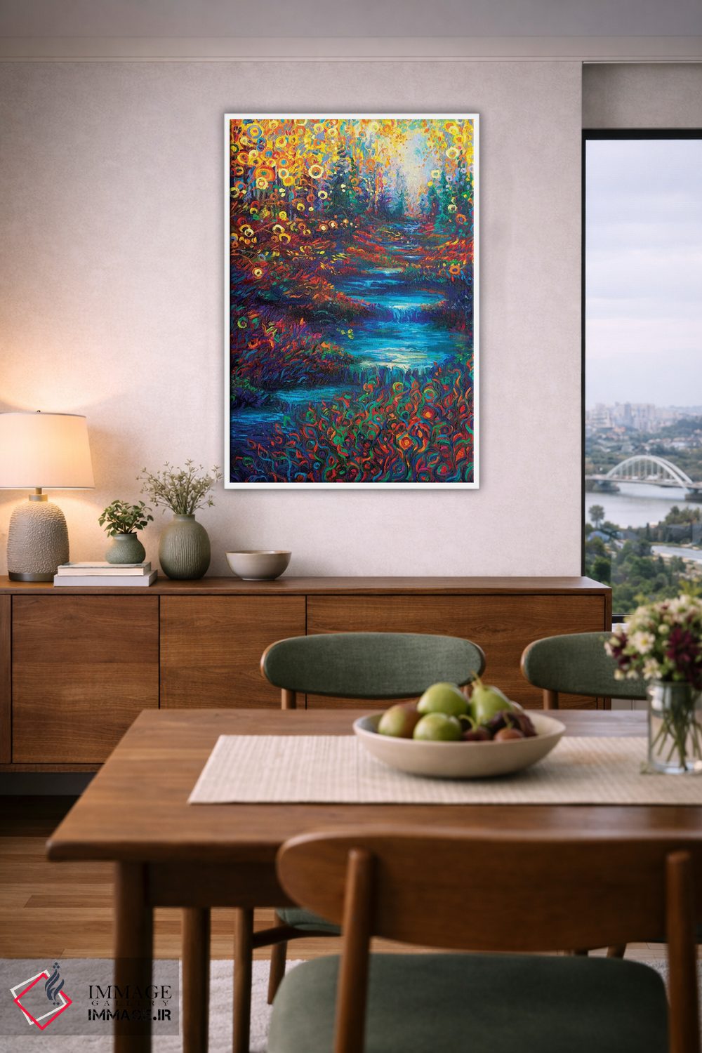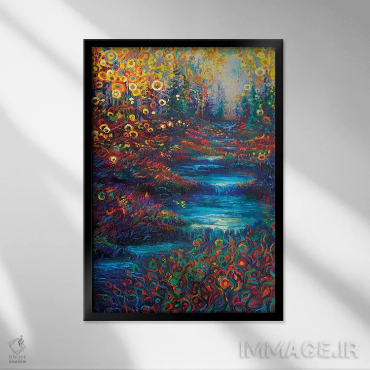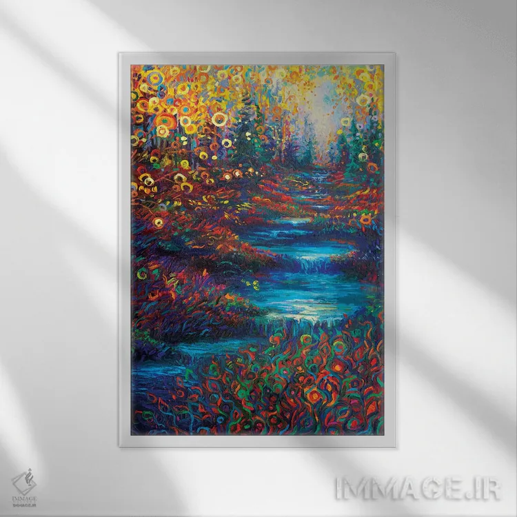 براساس پالت ترکیبی اثر، قاب تیک گرم (چوبی) پیشنهاد اول است و مشکی مات (فریم متوسط) مکمل. برای سفارشهای پروژهای با ابعاد و قابهای اختصاصی با ایماژ در تماس باشید.