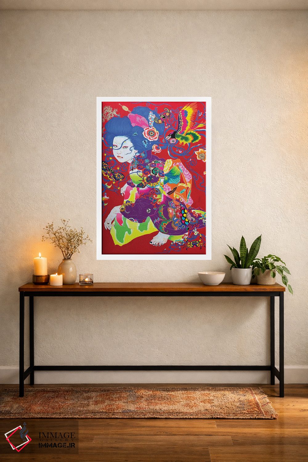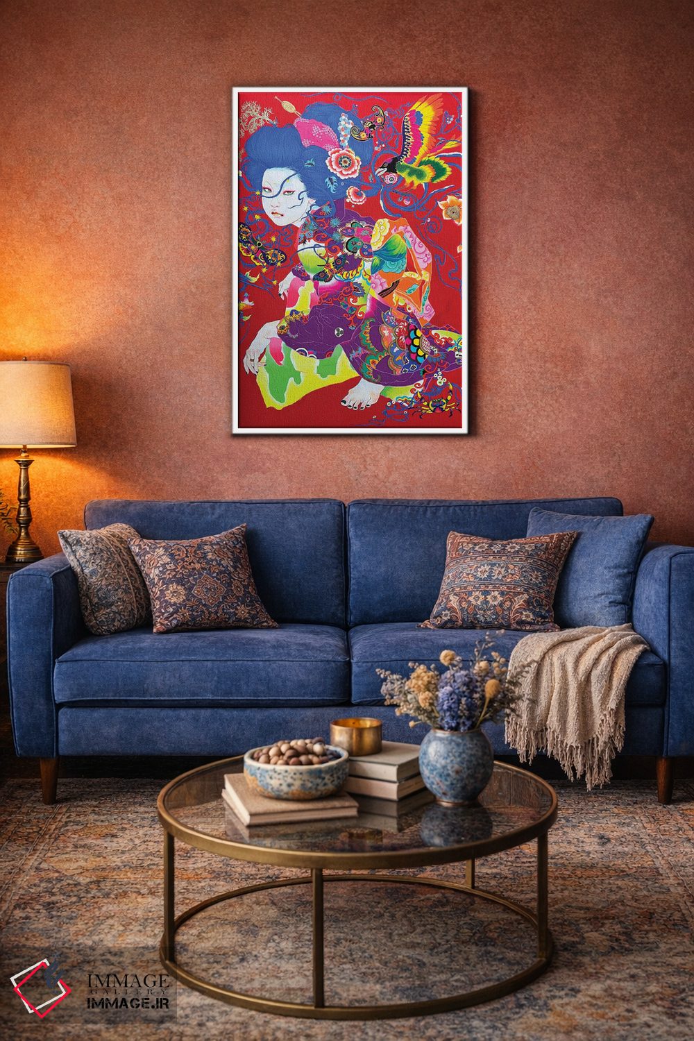 براساس پالت ترکیبی اثر، قاب تیک گرم (چوبی) پیشنهاد اول است و مشکی مات (فریم متوسط) مکمل. برای سفارشهای پروژهای با ابعاد و قابهای اختصاصی با ایماژ در تماس باشید.
