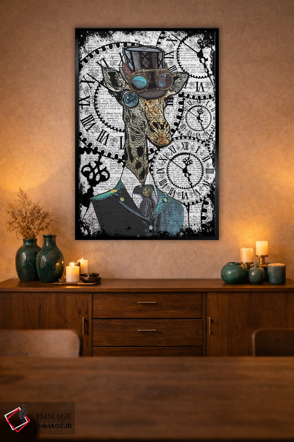 «زرافه استیمپانک» اثرِ «این د فریم شاپ (مغازه قابسازی هنری)» با حالوهوای دکوراسیون جایگزین و موضوعِ این اثر، برای فضاهای خلاقانه و متفاوت انتخابی جسورانه اما مرتب است.