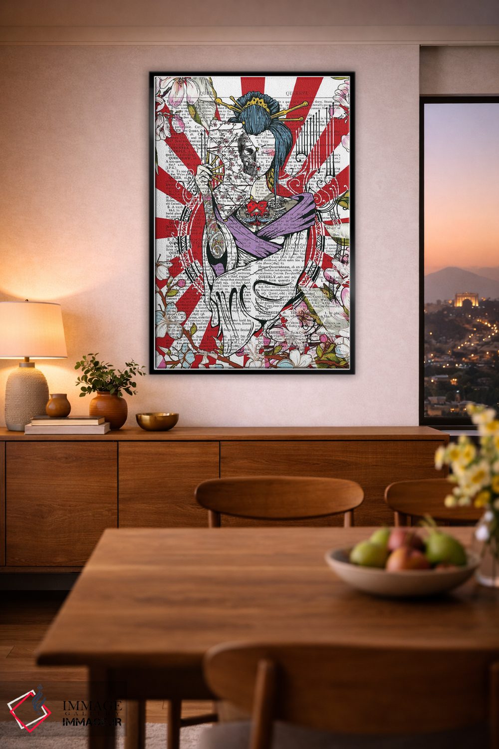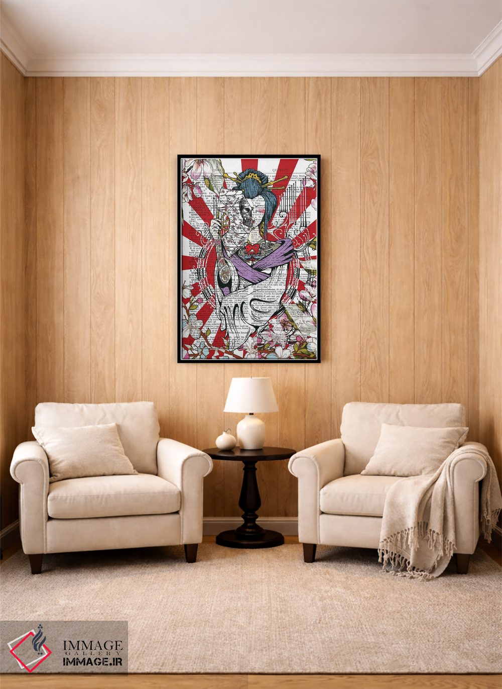 «گیشای خالکوبیشده» اثرِ «این د فریم شاپ (مغازه قابسازی هنری)» با حالوهوای دکوراسیون جایگزین و موضوعِ این اثر، برای فضاهای خلاقانه و متفاوت انتخابی جسورانه اما مرتب است.