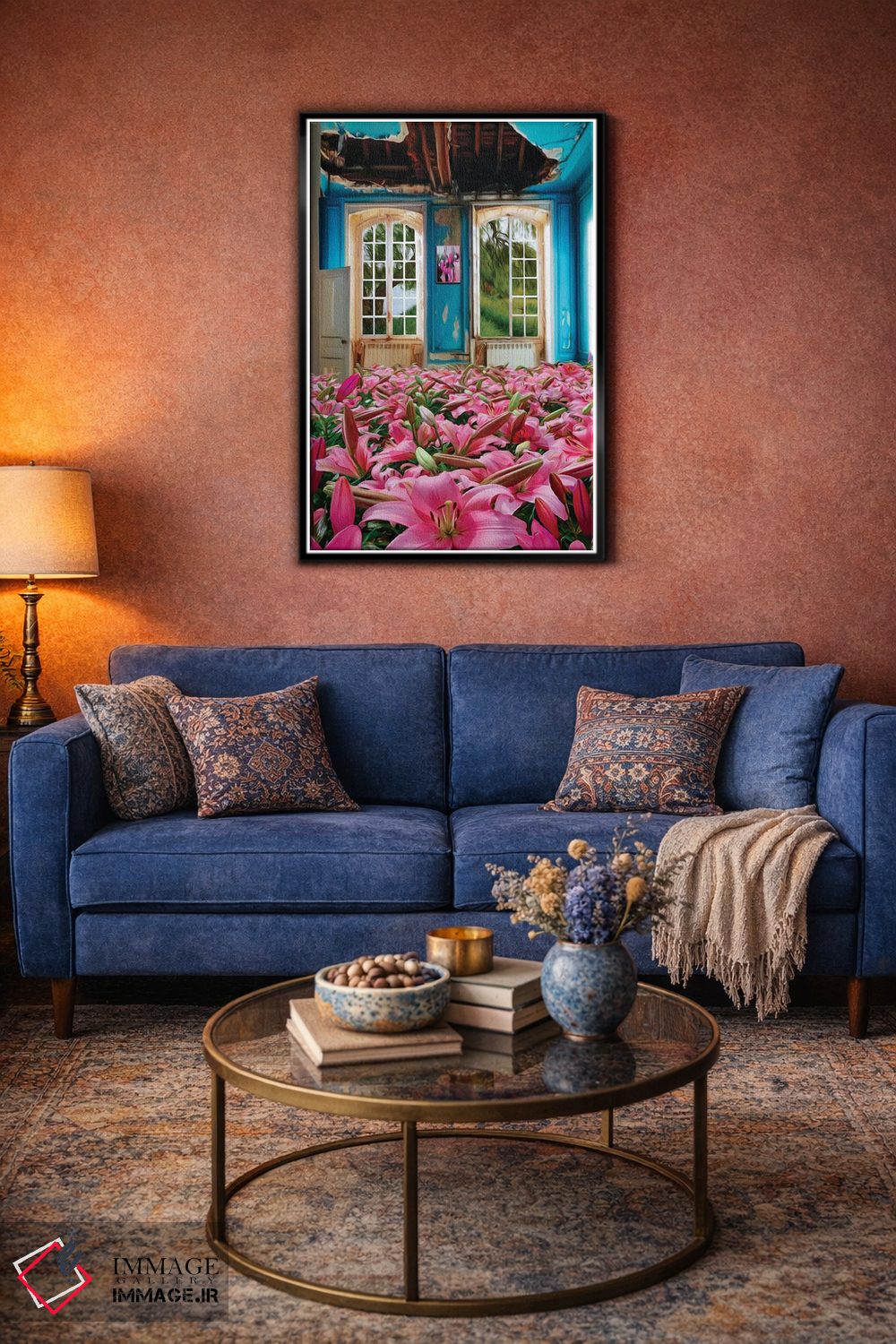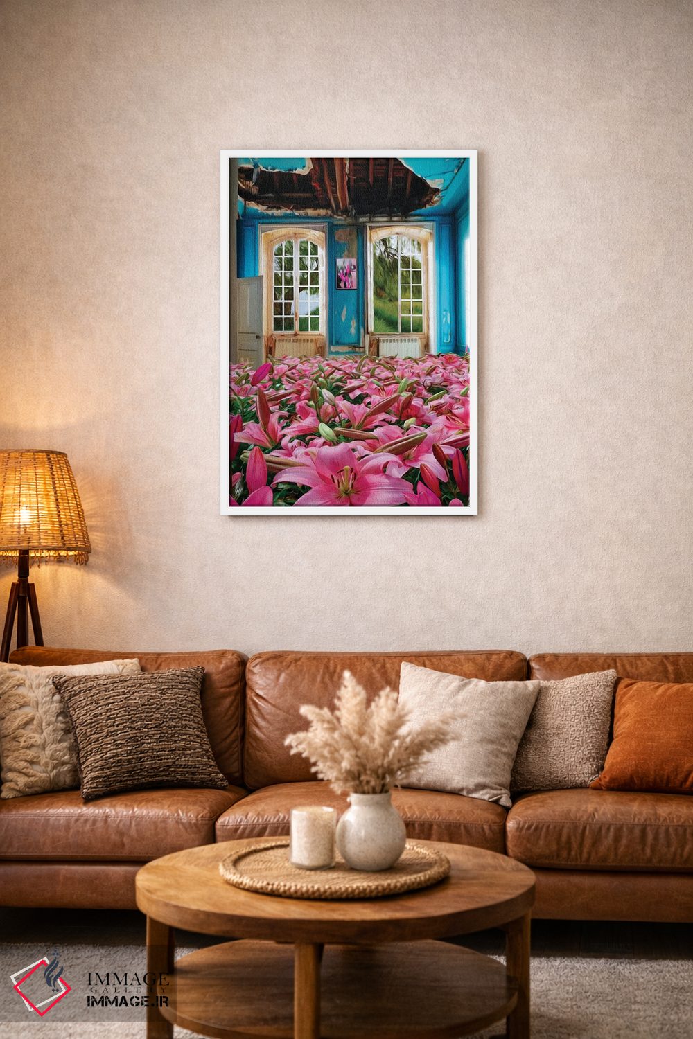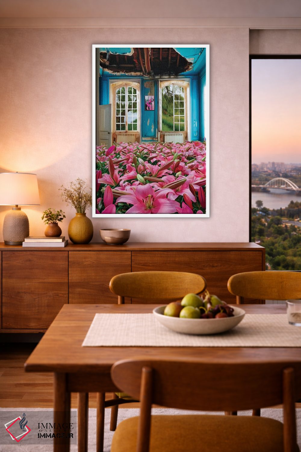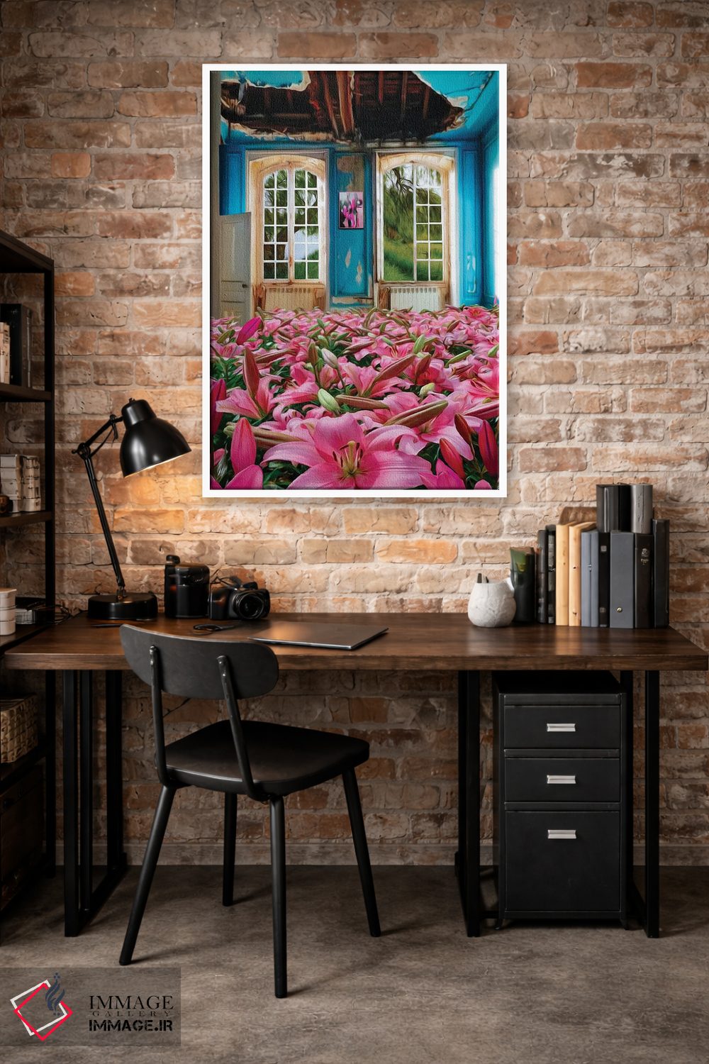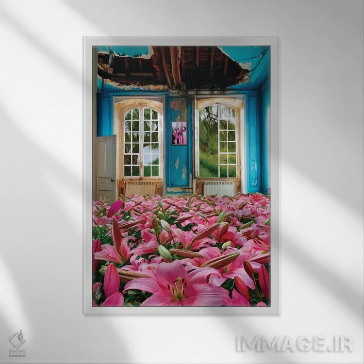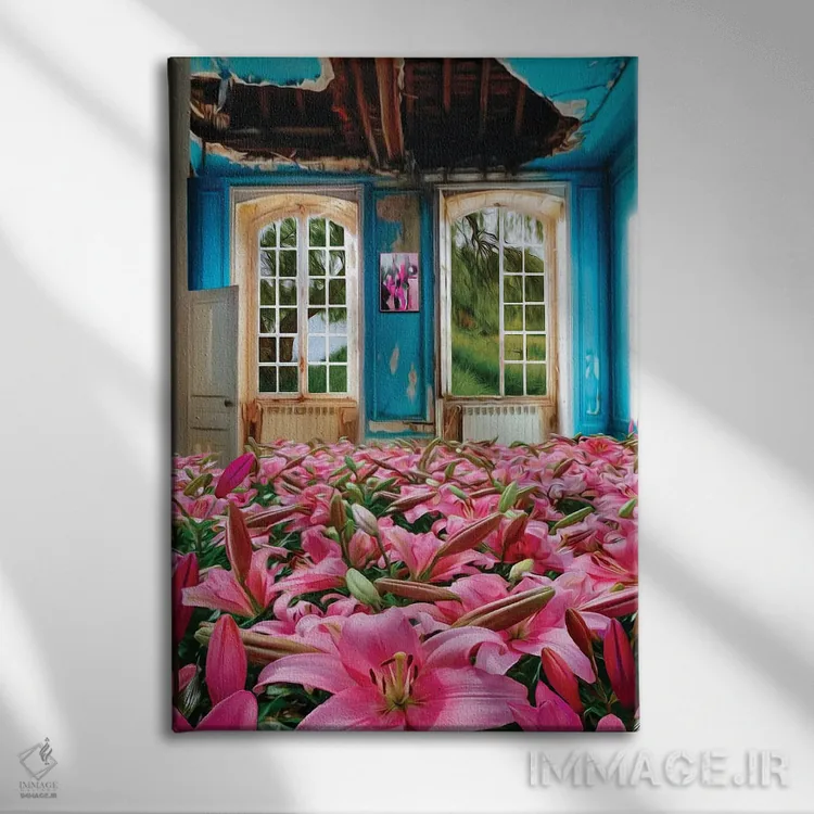 تابلو دکوراتیو سوسن های صورتی رشدکرده در خانه متروکه اثر ایوجنیا بیدیوک