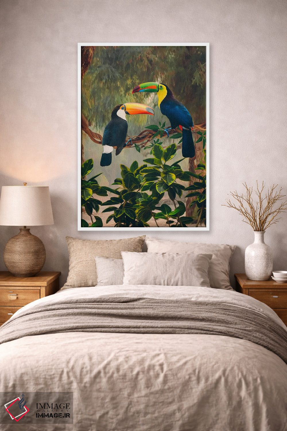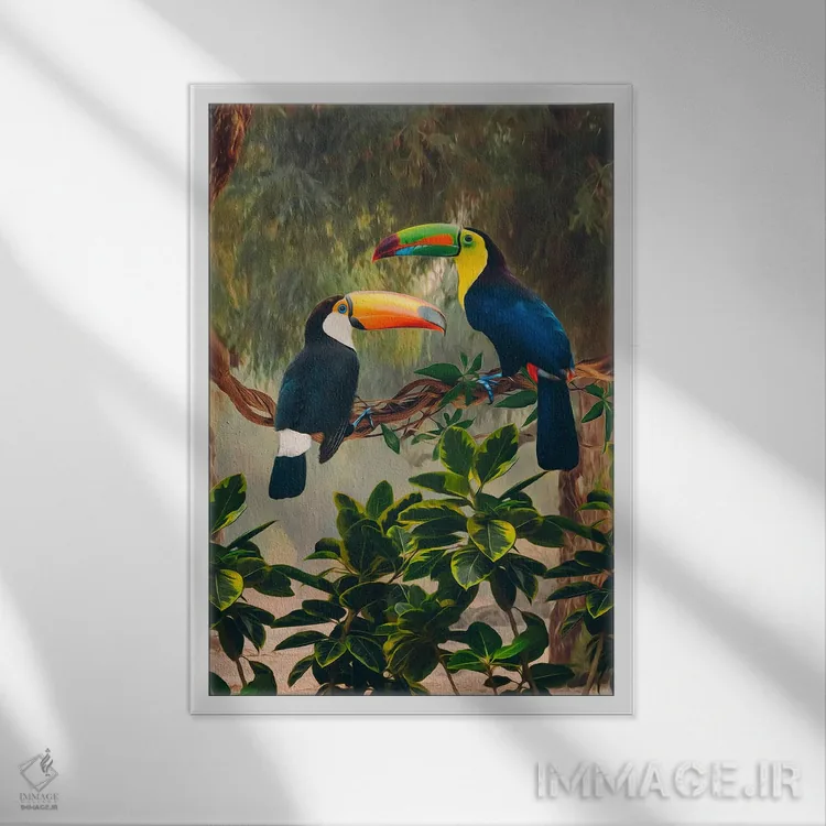 این اثر با عنوان «دو توکان آفریقایی روی شاخه» اثرِ «ایوجنیا بیدیوک» بدون کودکانه شدن، بازیگوش و خوشپرداخت میماند؛ برای فضاهای روستیک یا بوهو انتخابی خوشسلیقه است. حسش صمیمی است، اما کیفیتش جدی و خوشپرداخت.