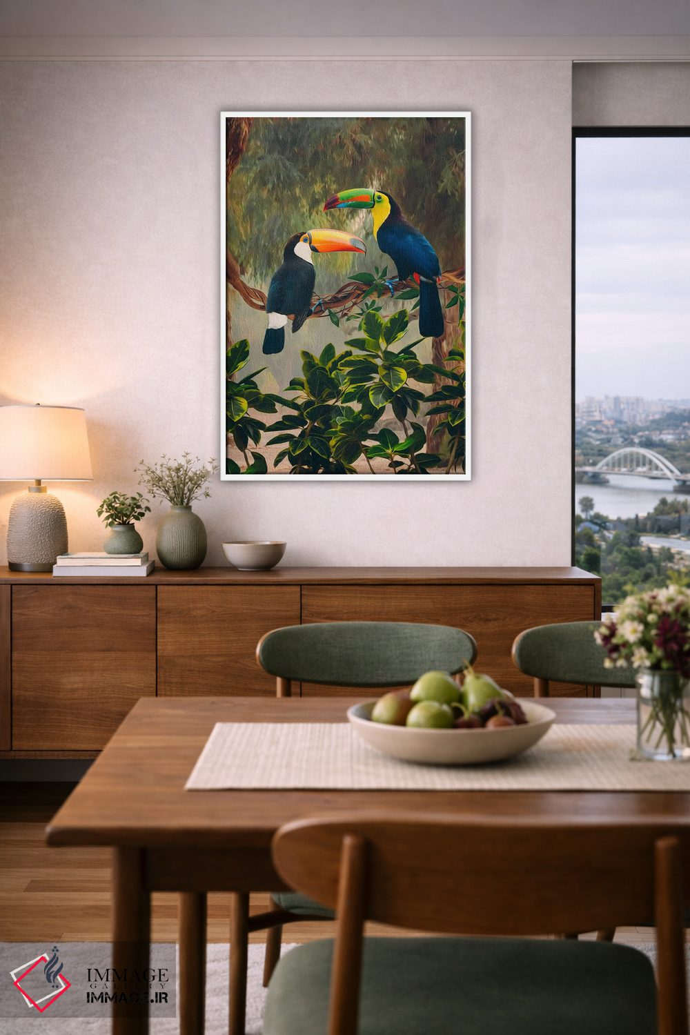 براساس پالت ترکیبی اثر، قاب بلوط روشن (چوبی) پیشنهاد اول است و استخوانی ملایم مکمل. برای سفارشهای پروژهای با ابعاد و قابهای اختصاصی با ایماژ در تماس باشید.