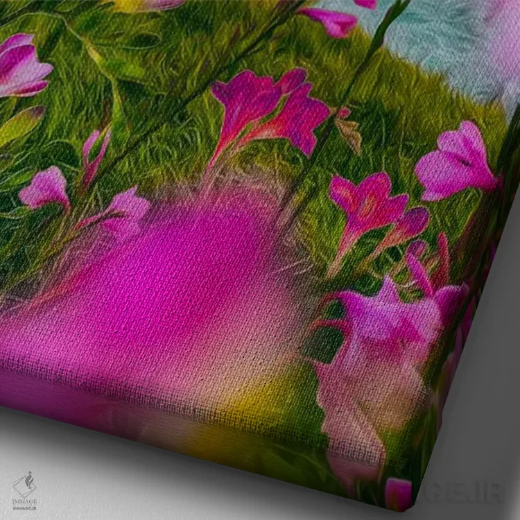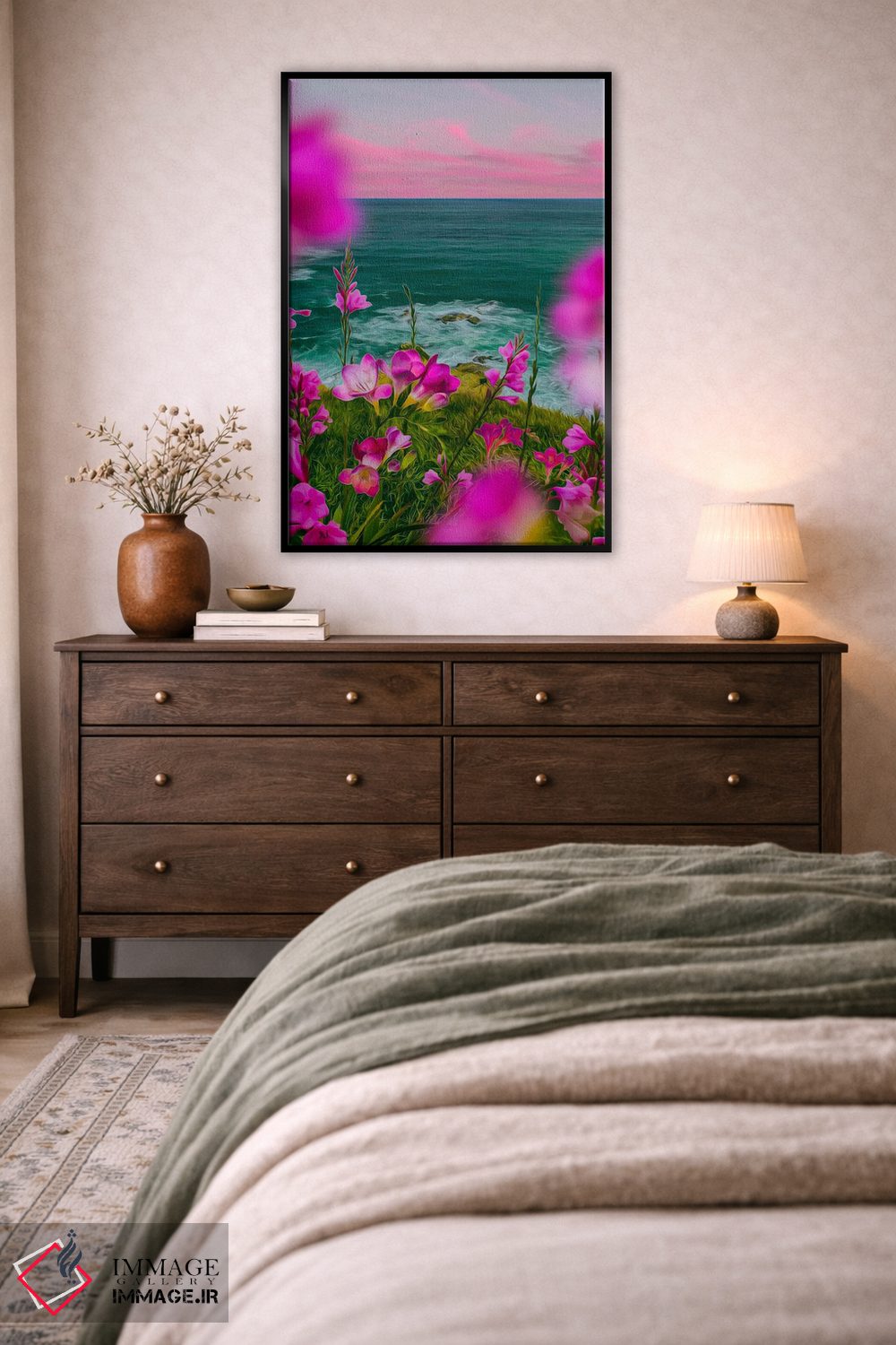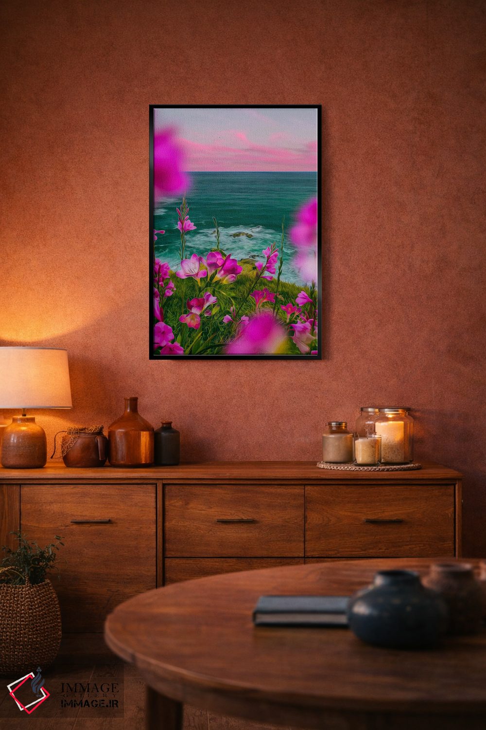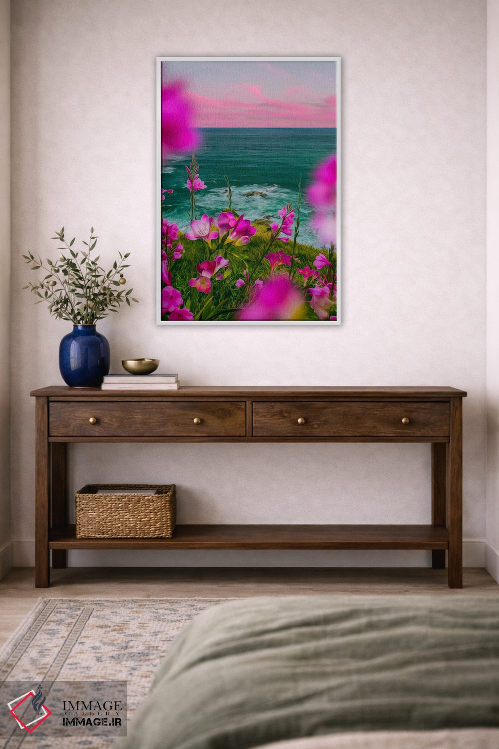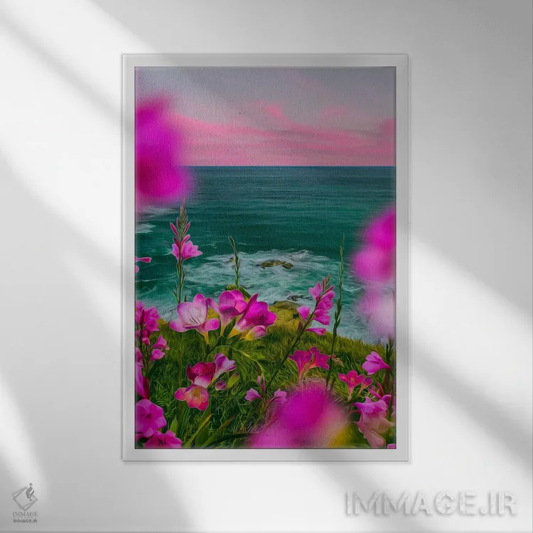 تابلو دکوراتیو فریزیا صورتی شکوفا بر تپه ای در کنار دریا اثر ایوجنیا بیدیوک
