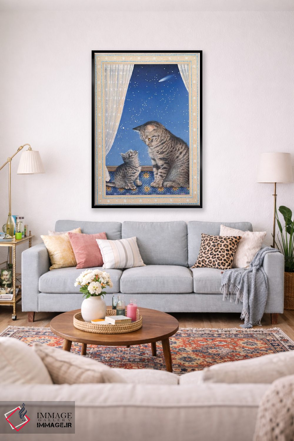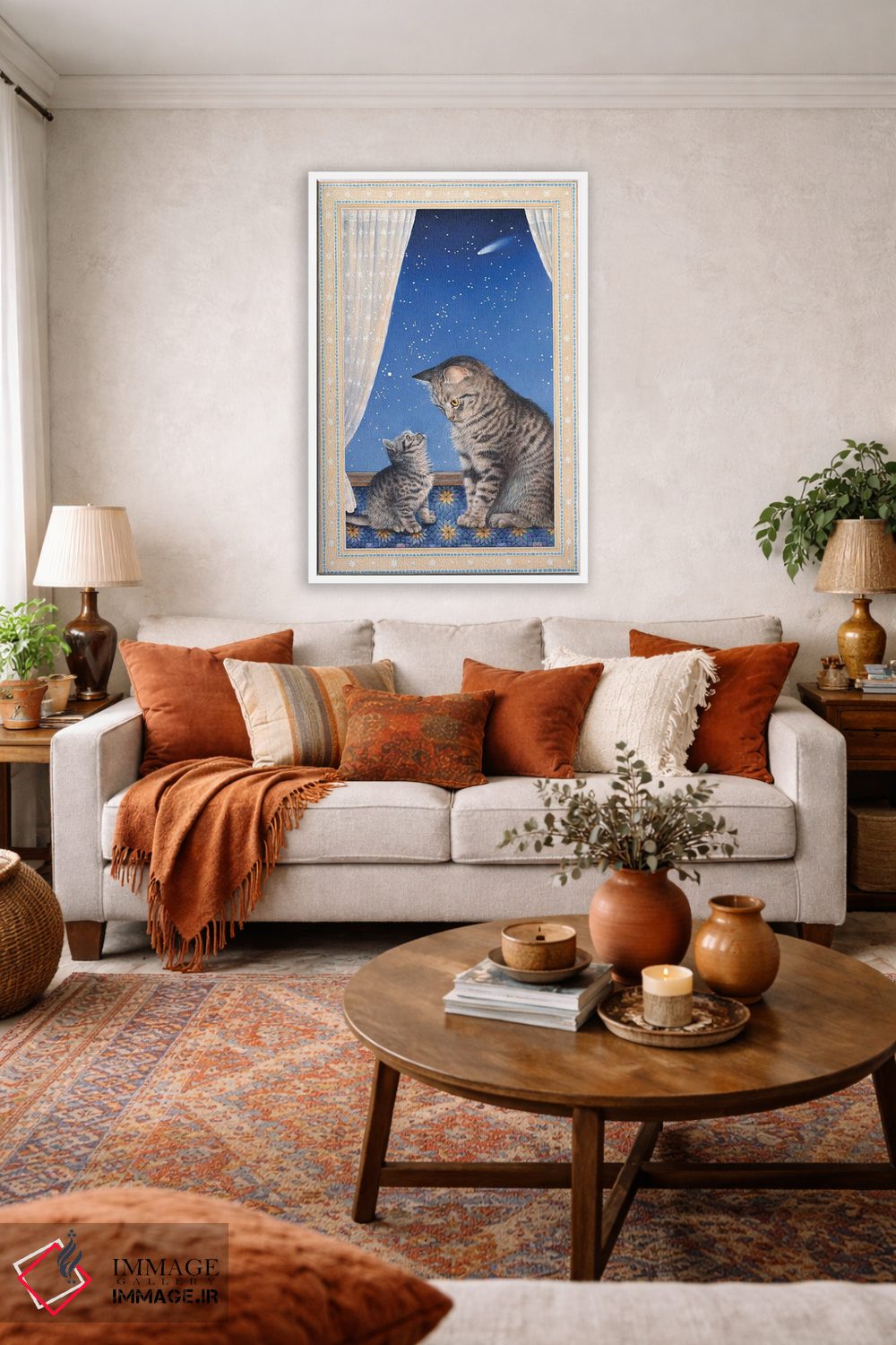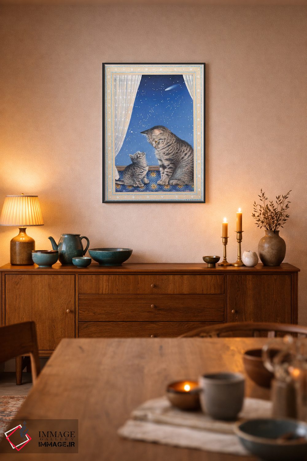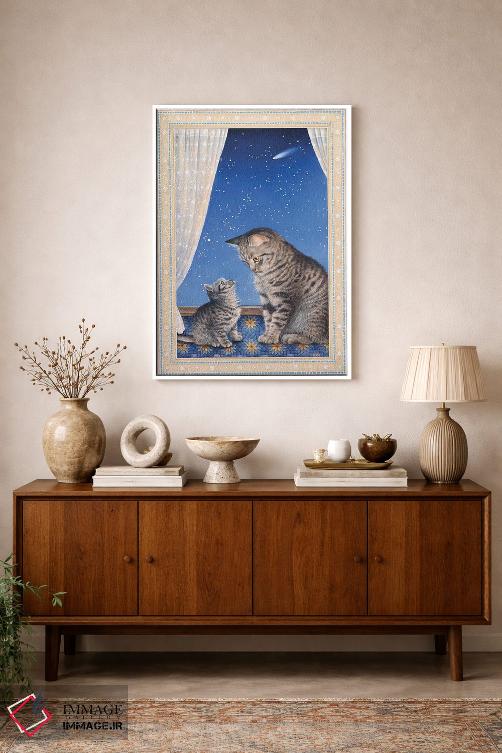 برای دکورهای صمیمی، «مینتاکا با مادرش لوسی» اثرِ «آیوری کتس (برند هنری نقاشی گربه)» مثل یک امضای بامزه اما متین عمل میکند؛ برای خانههایی با چوب و پارچههای گرم انتخابی خوشسلیقه است. به دیوار، قصه میدهد—اما قصهای آرام و شیک.