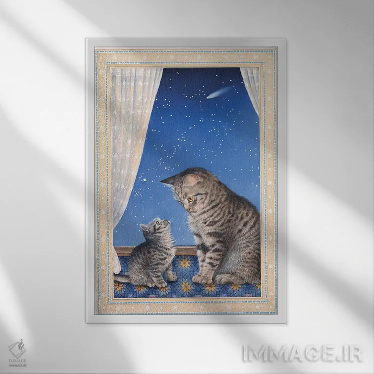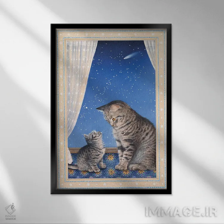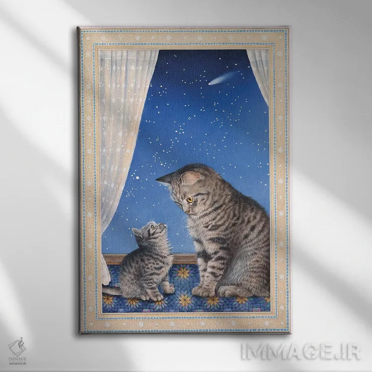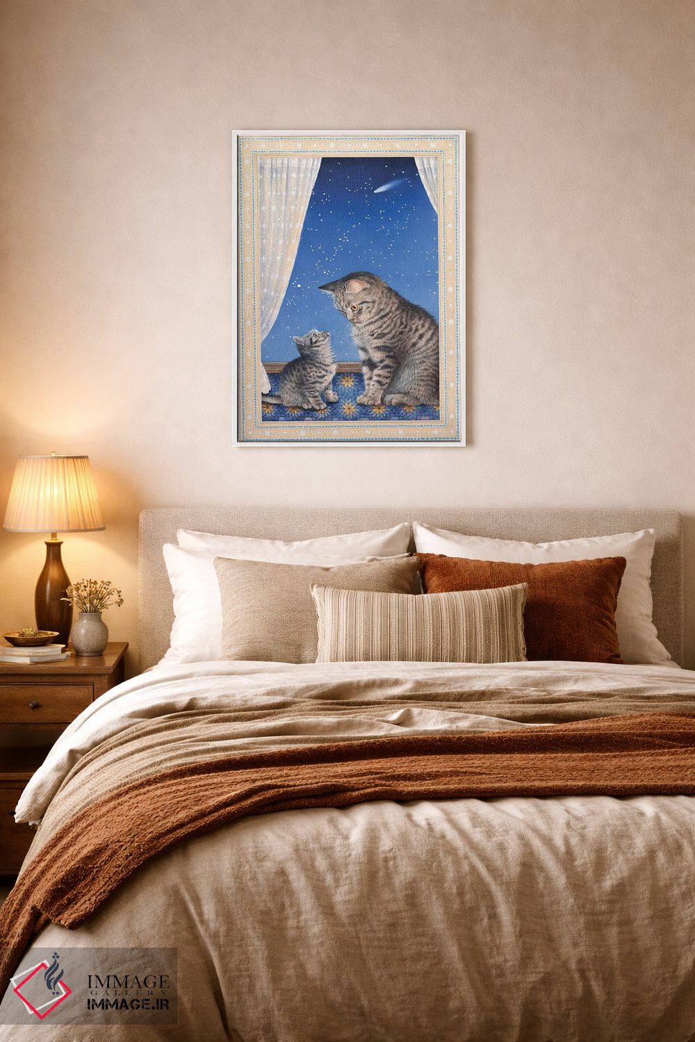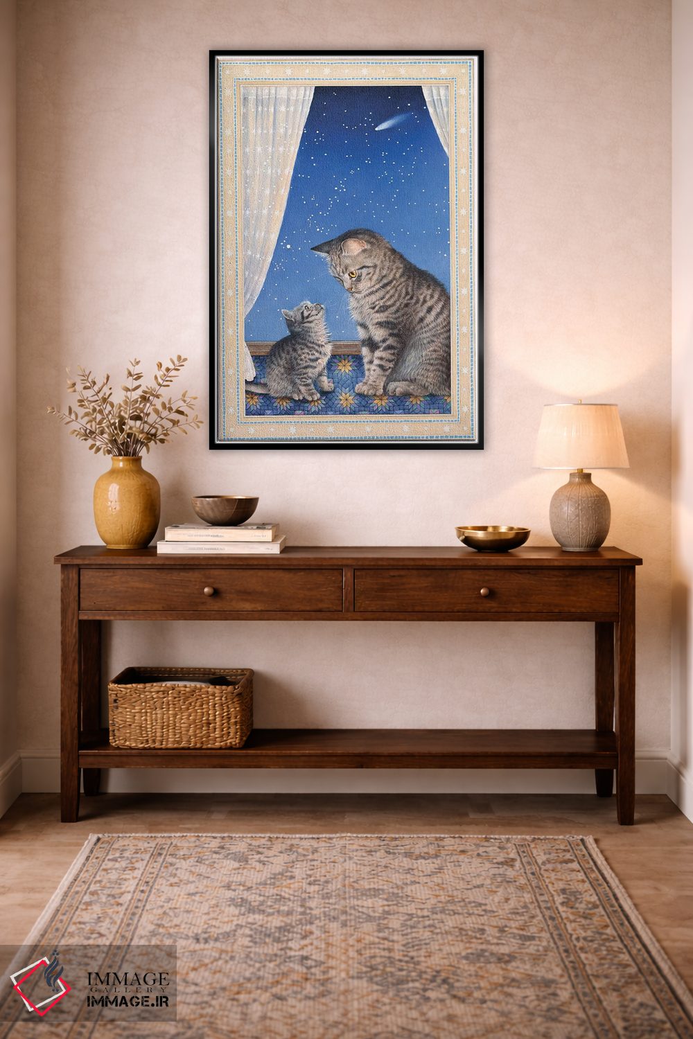 برای دکورهای صمیمی، «مینتاکا با مادرش لوسی» اثرِ «آیوری کتس (برند هنری نقاشی گربه)» مثل یک امضای بامزه اما متین عمل میکند؛ برای خانههایی با چوب و پارچههای گرم انتخابی خوشسلیقه است. به دیوار، قصه میدهد—اما قصهای آرام و شیک.