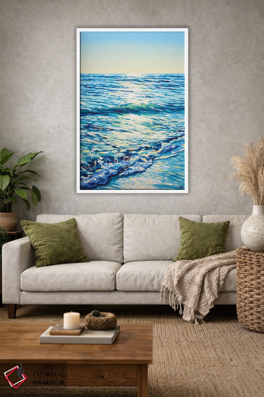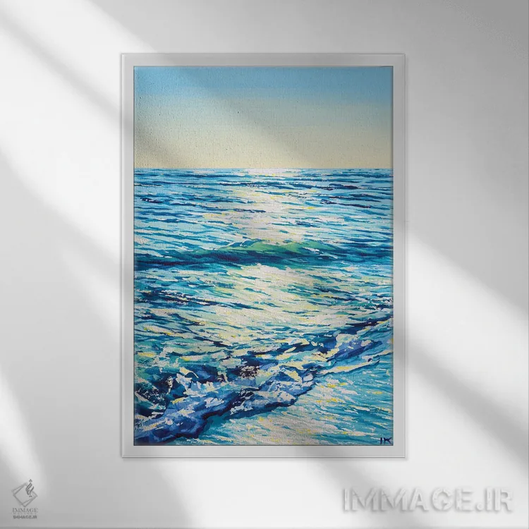 «دریا III» اثرِ «ایرینا کاستسووا» در فضای دکور ساحلی، کنار پارچههای روشن و اکسسوریهای طبیعی (حصیر/چوب) عالی هماهنگ میشود.