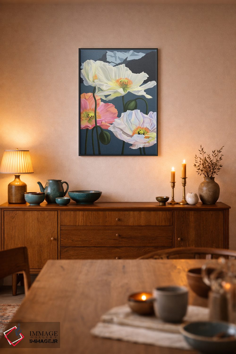 ساختار بوم گالری ایماژ طوری است که اثر روی دیوار «پرداختشده» و حرفهای دیده شود—نه پرزرقوبرقِ بیپایه؛ بلکه دقیق و خوشپرداخت. بافت ظریف کنواس باعث میشود حس اثر هنری را در نگاه نزدیک نگه میدارد و برای محیطهای رسمیتر هم انتخاب مطمئنی است. در قابپذیری، هماهنگی قاب با پالت رنگ جلوه را تقویت میکند و همین «پرداخت» تفاوت را میسازد. حاصل کار، یک تابلو خوشنشین است که هم از دور اثرگذار است و هم از نزدیک خوشخوان؛ در کنار نورپردازی درست، جلوهی گالریوار بیشتری حس میشود.
