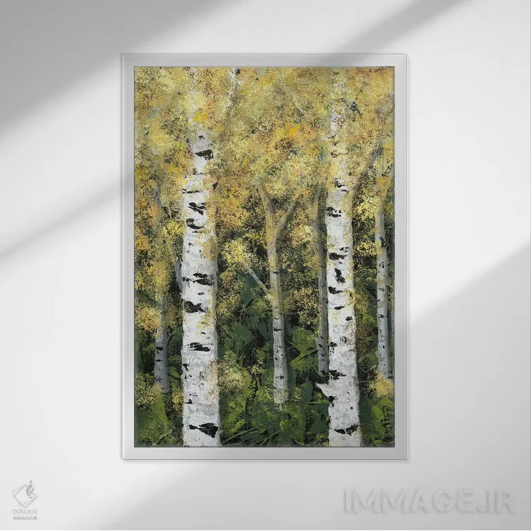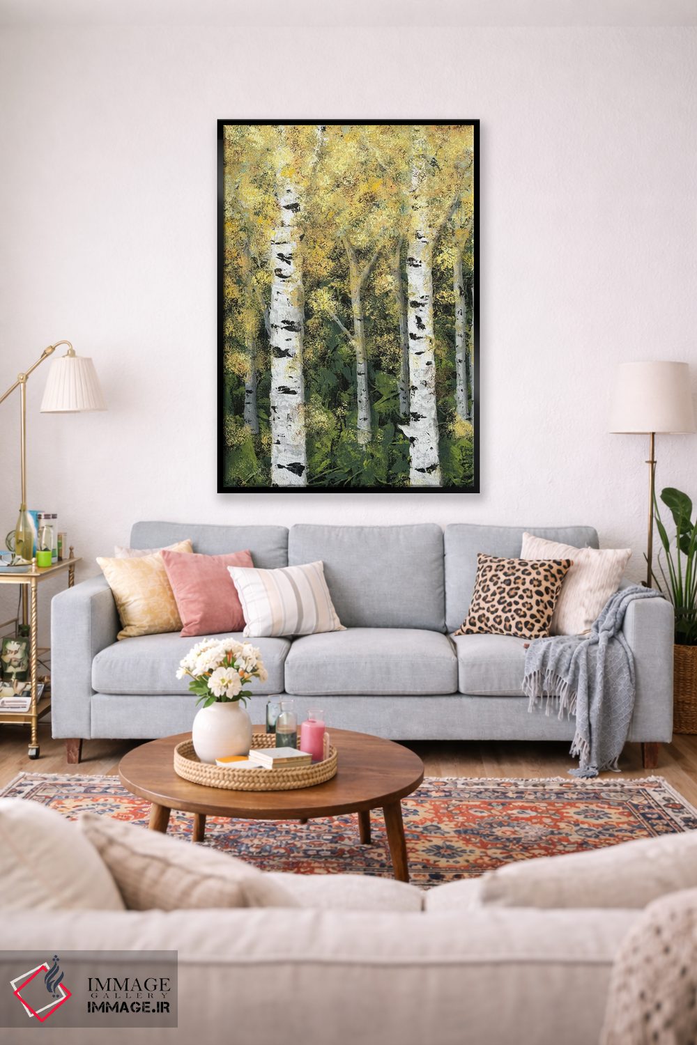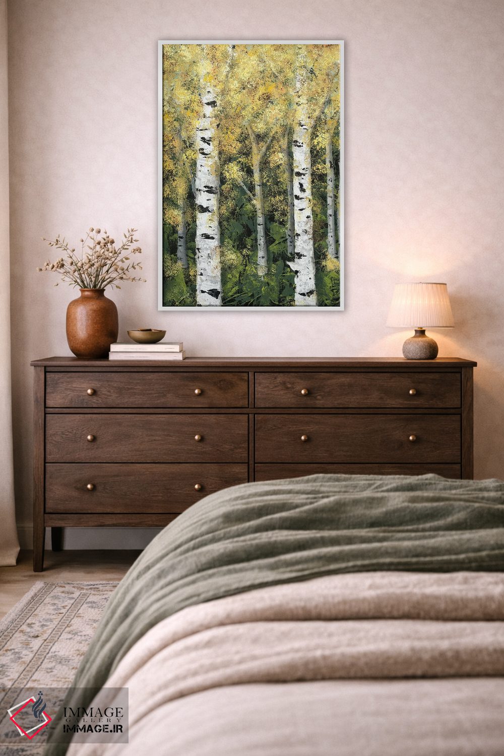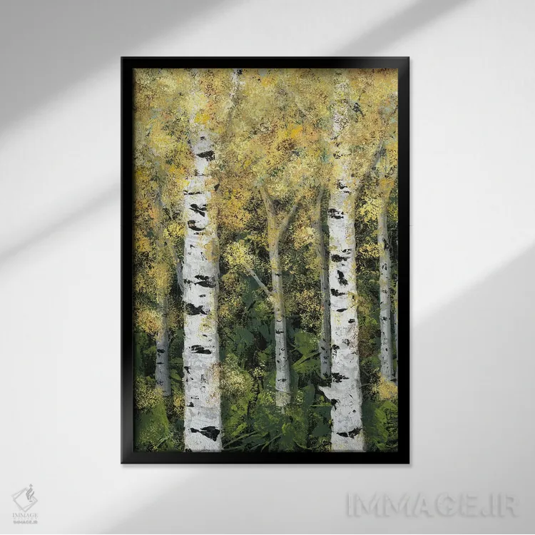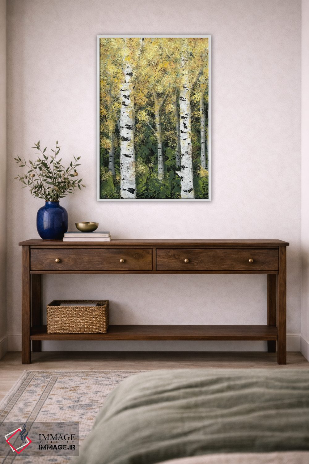 اگر به دکورهای طبیعی علاقه دارید، «خط درختان توسکا I» اثرِ «جید رینولدز» برای دیوارهای ساده، یک لطافتِ دقیق میسازد، برای نشیمنهای روشن گزینهٔ مناسبیست. با قاب روشن یا چوبی، حس طبیعیتری پیدا میکند.