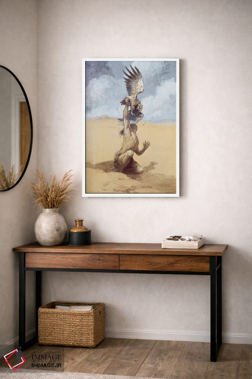 براساس پالت گرم اثر، قاب بلوط روشن (چوبی) پیشنهاد اول است و استخوانی ملایم مکمل. برای سفارشهای پروژهای با ابعاد و قابهای اختصاصی با ایماژ در تماس باشید.