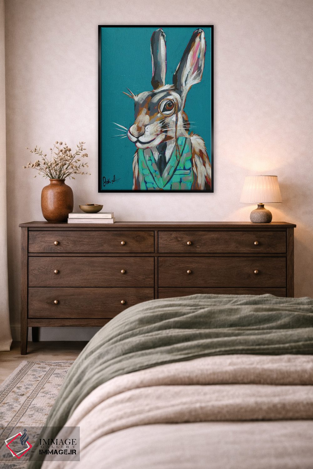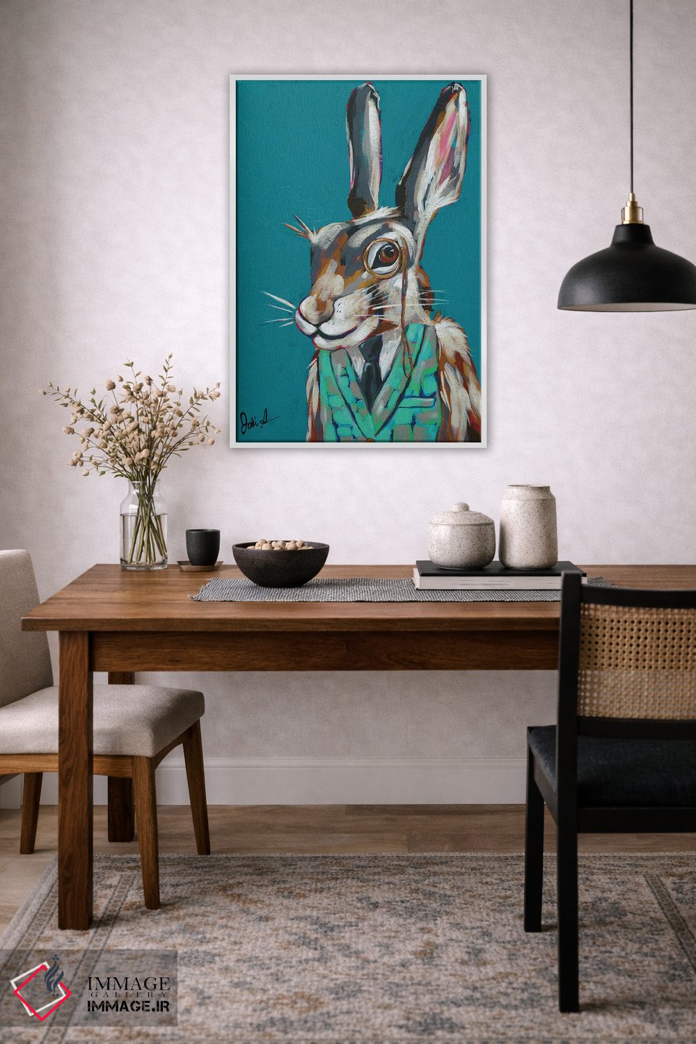 «حیوانات جاسوس III—خرگوش معماگو» اثرِ «جودی آگوستین» از آن کارهاییست که در کنار رنگهای خنثی، تضاد دلچسبی میسازد؛ برای اتاق بازی یا گوشهٔ مطالعه انتخاب خوبیست. به دیوار، قصه میدهد—اما قصهای آرام و شیک.