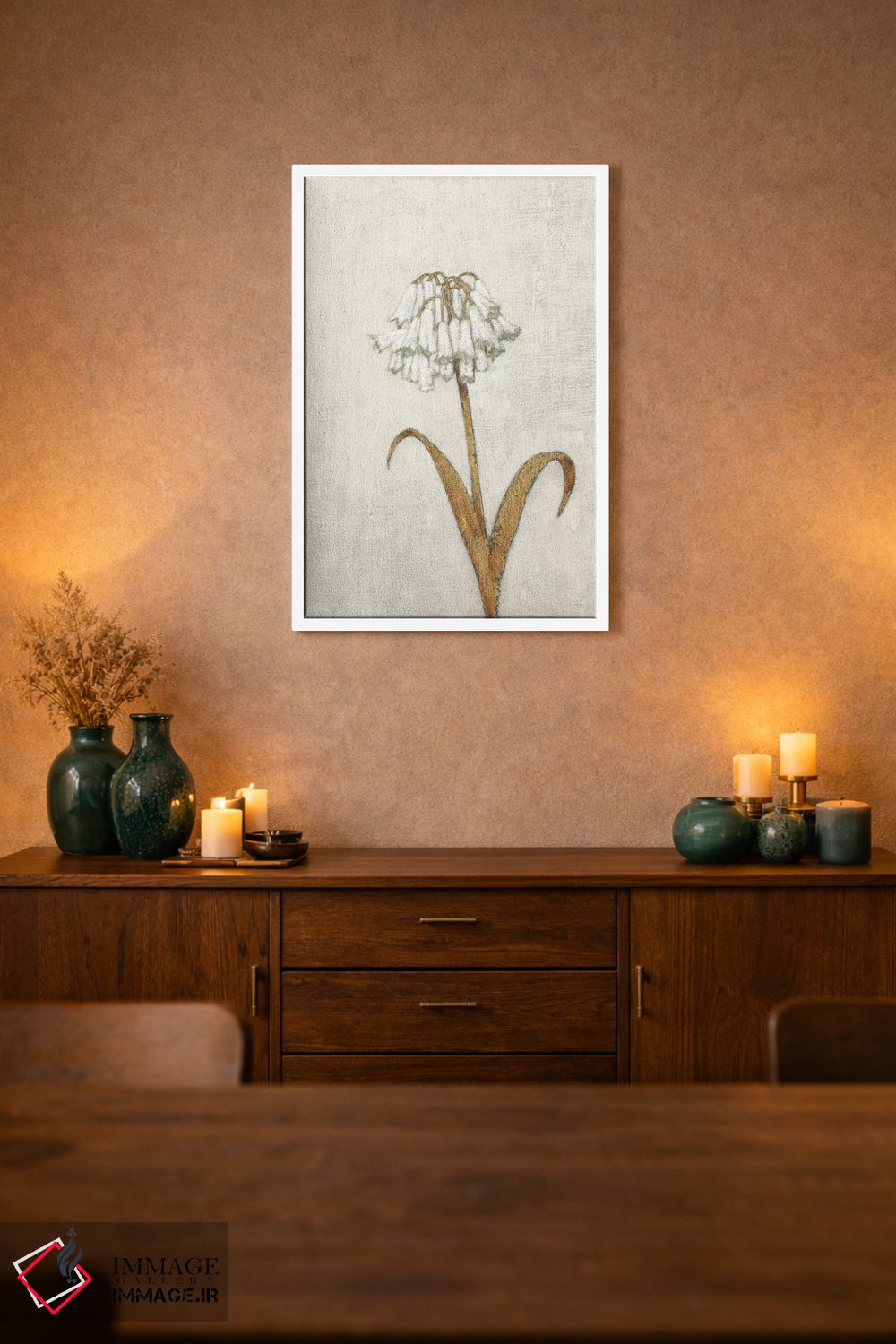 براساس پالت گرم اثر، قاب تیک گرم (چوبی) پیشنهاد اول است و مشکی مات (فریم متوسط) مکمل. برای سفارشهای پروژهای با ابعاد و قابهای اختصاصی با ایماژ در تماس باشید.