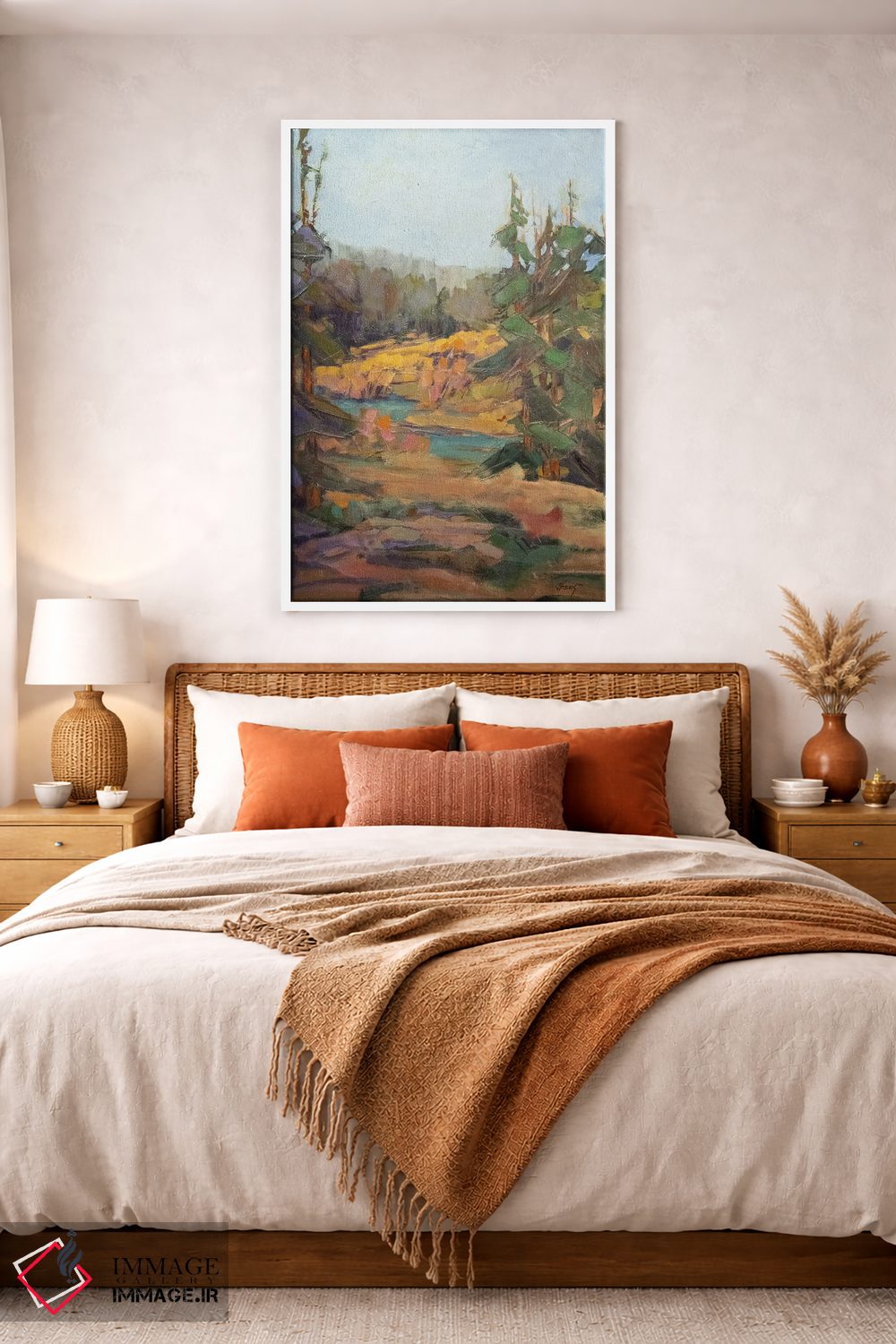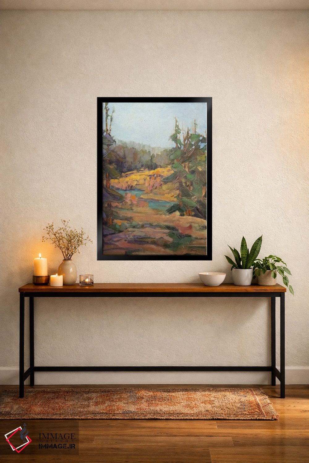 براساس پالت گرم اثر، قاب بلوط روشن (چوبی) پیشنهاد اول است و استخوانی ملایم مکمل. برای سفارشهای پروژهای با ابعاد و قابهای اختصاصی با ایماژ در تماس باشید.