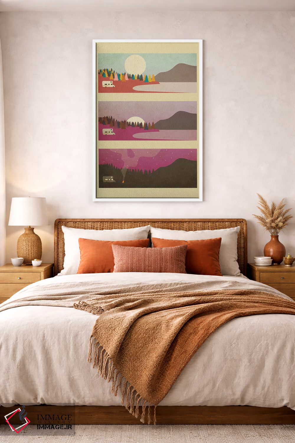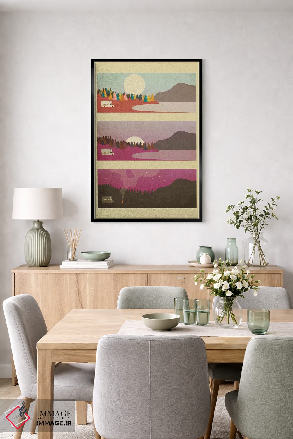 براساس پالت گرم اثر، قاب بلوط روشن (چوبی) پیشنهاد اول است و استخوانی ملایم مکمل. برای سفارشهای پروژهای با ابعاد و قابهای اختصاصی با ایماژ در تماس باشید.