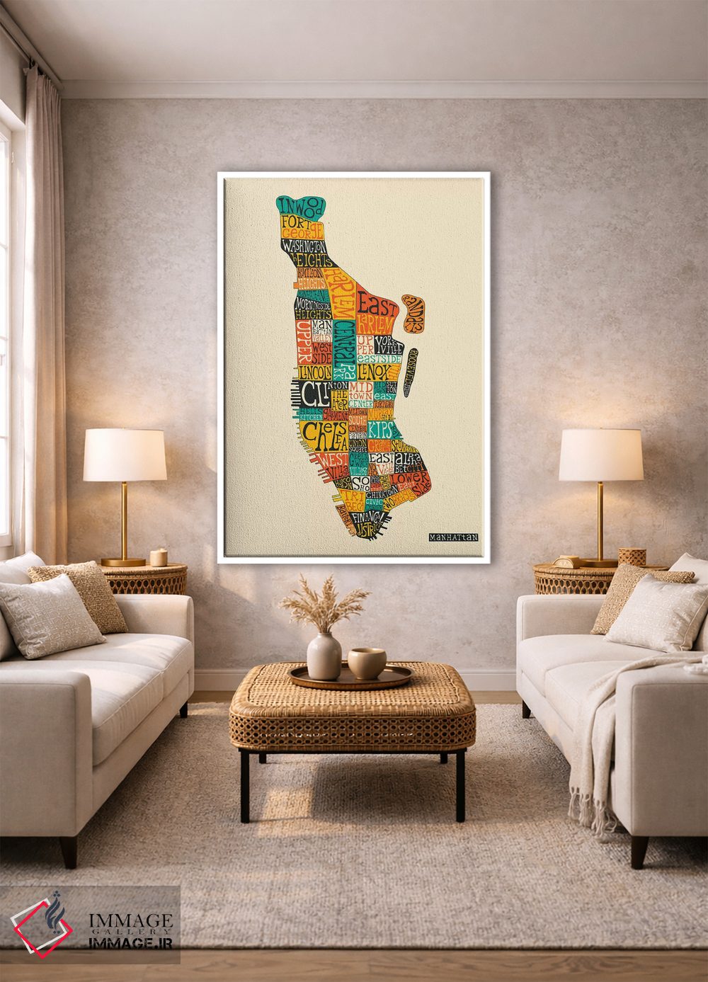 این تابلو تزئینی با موضوعِ این اثر برای هدیه و دکورهای روشن همیشه جواب میدهد: «منهتن» اثرِ «جازبری بلو (هنرمند مدرن/برند هنری)».