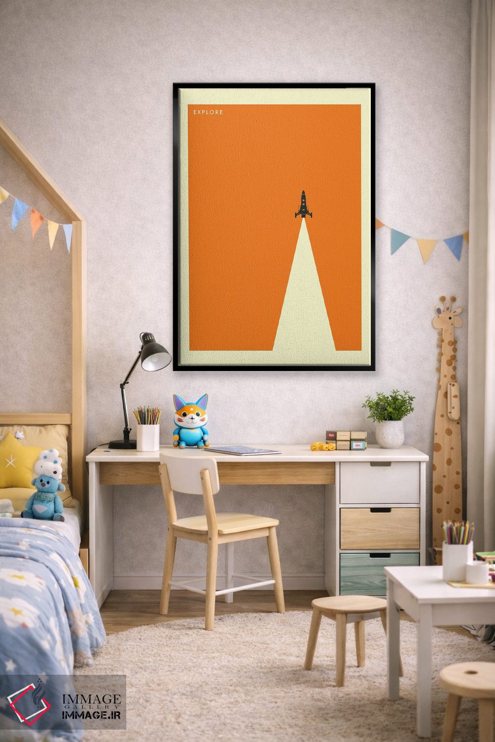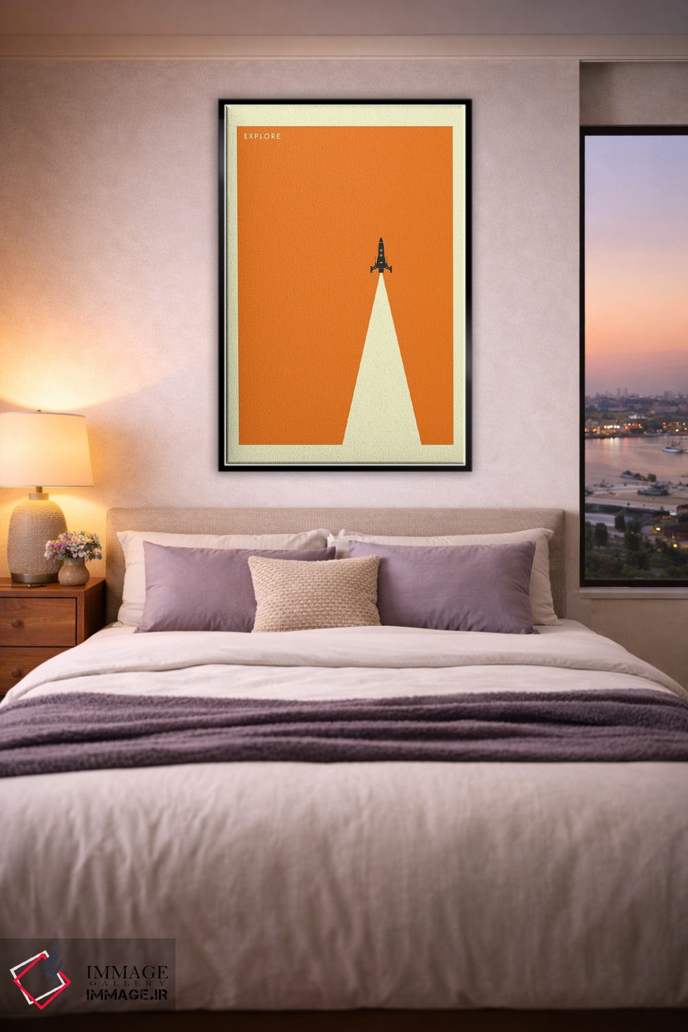 براساس پالت گرم اثر، قاب بلوط روشن (چوبی) پیشنهاد اول است و استخوانی ملایم مکمل. برای سفارشهای پروژهای با ابعاد و قابهای اختصاصی با ایماژ در تماس باشید.