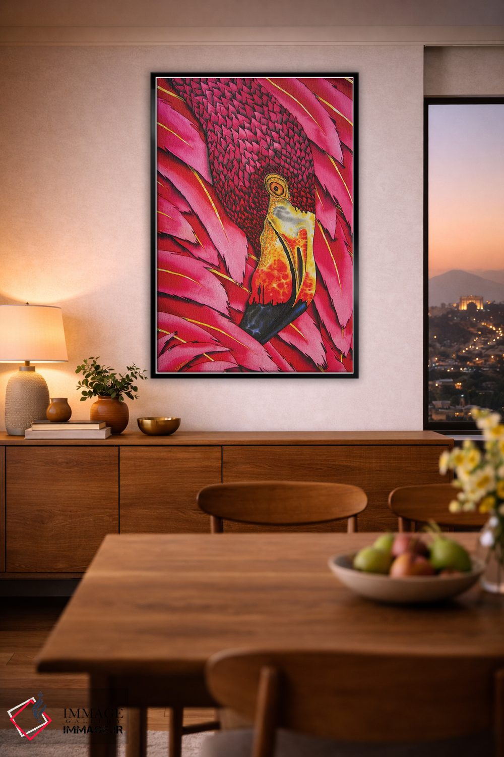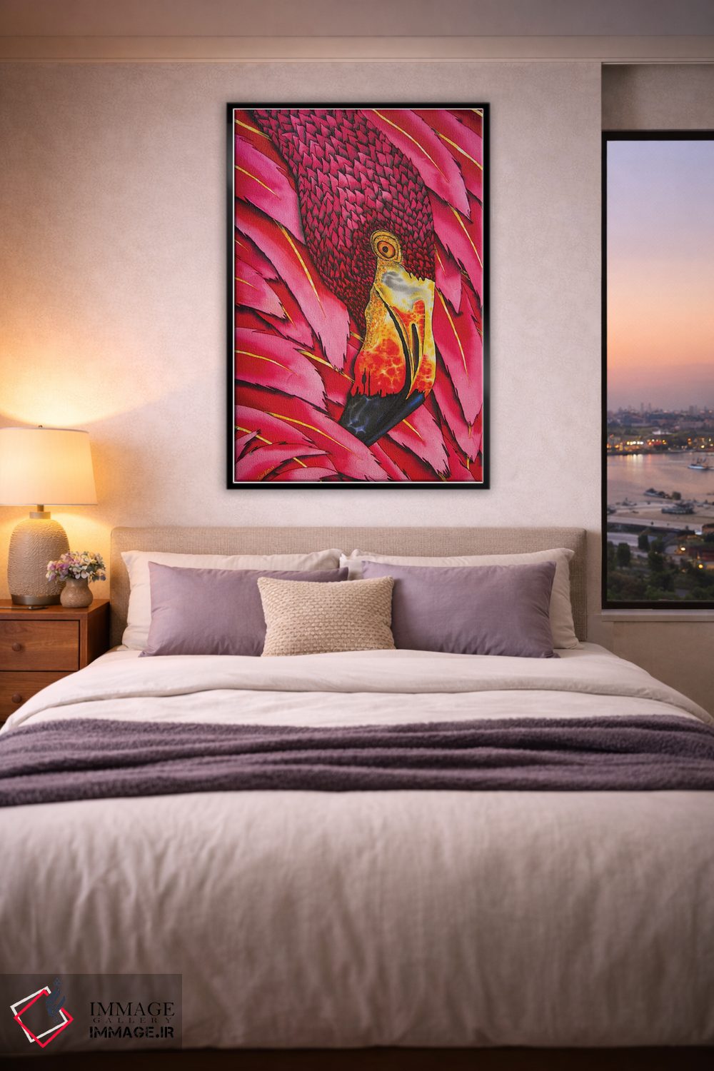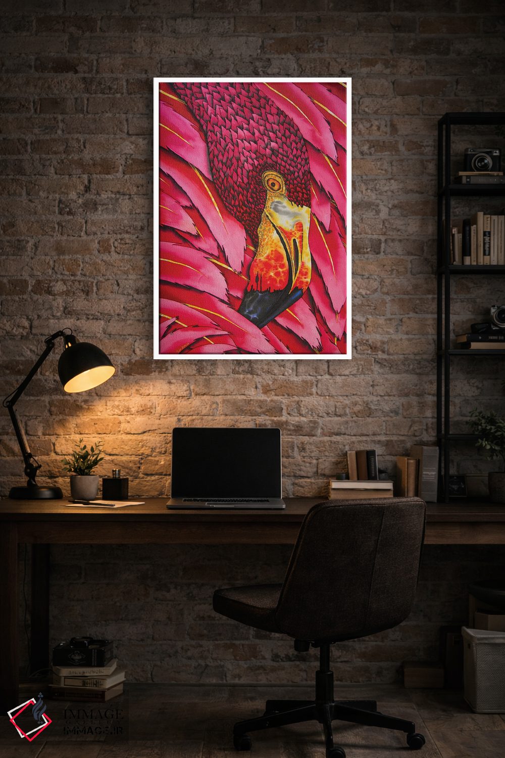این اثر با عنوان «فلامینگوی شعلهور» اثرِ «دنیل ژان—باپتیست» بافت و جزئیات را طوری نشان میدهد که نگاه میماند؛ برای دکورهای مدرن و مینیمال انتخابی خوشسلیقه است. با قاب چوبی یا مشکی، حس مرتبتری پیدا میکند.