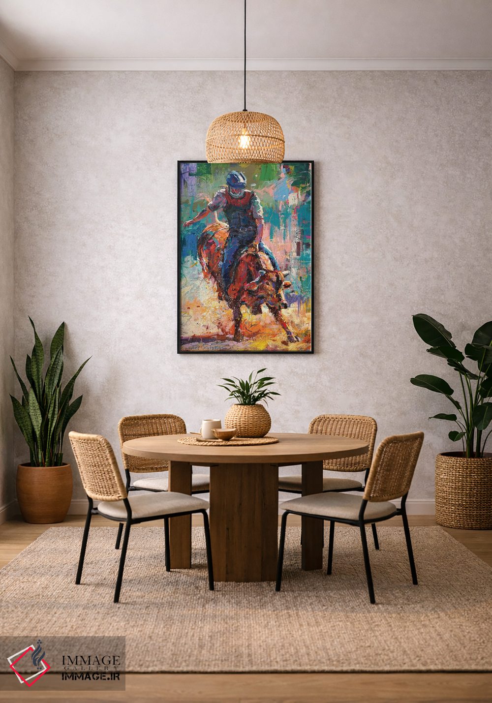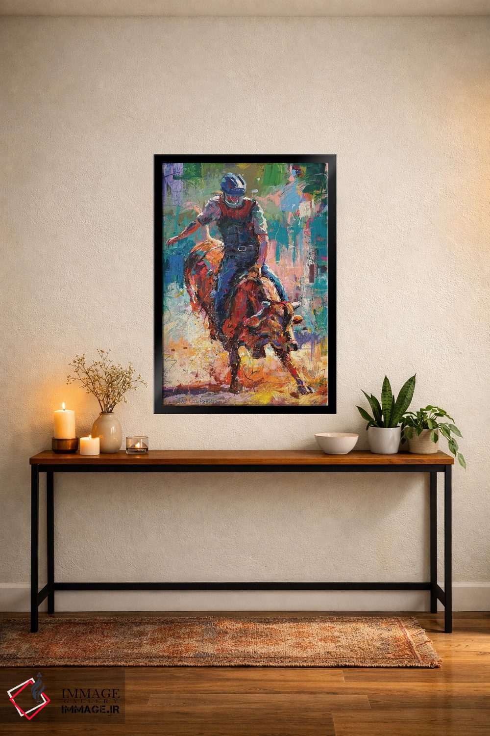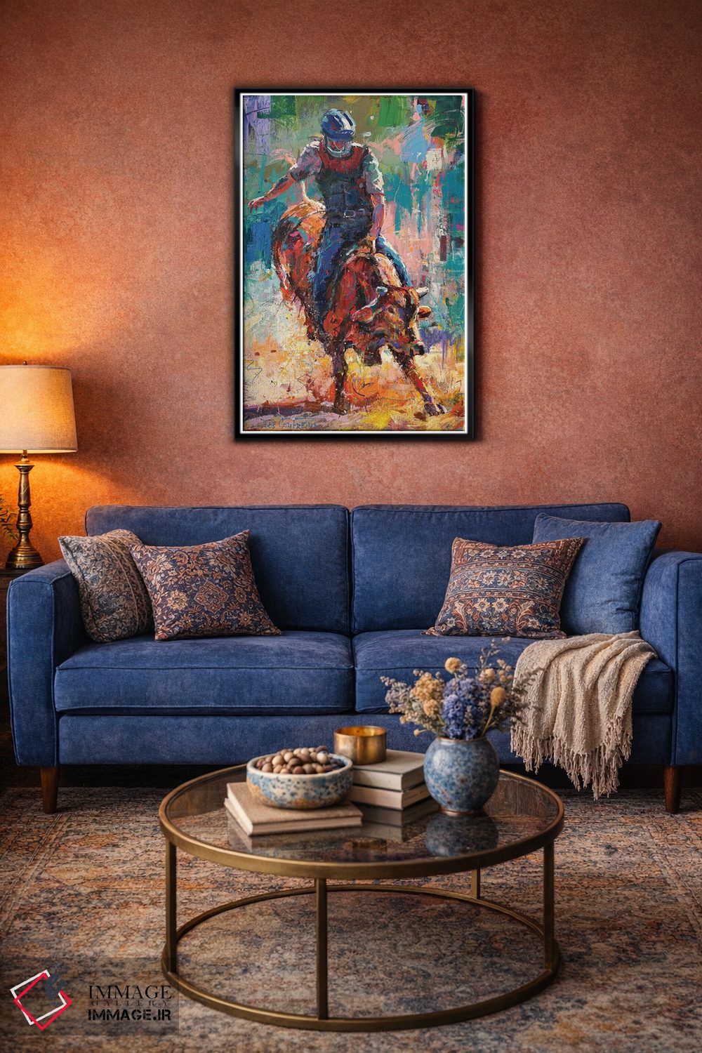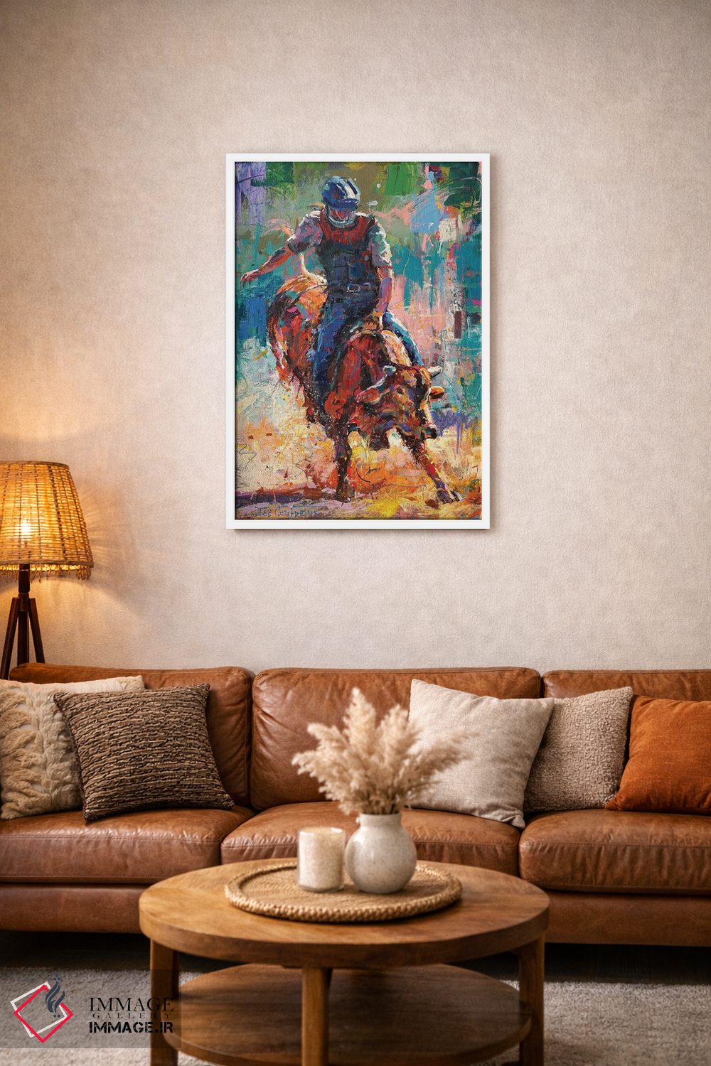 براساس پالت ترکیبی اثر، قاب تیک گرم (چوبی) پیشنهاد اول است و مشکی مات (فریم متوسط) مکمل. برای سفارشهای پروژهای با ابعاد و قابهای اختصاصی با ایماژ در تماس باشید.