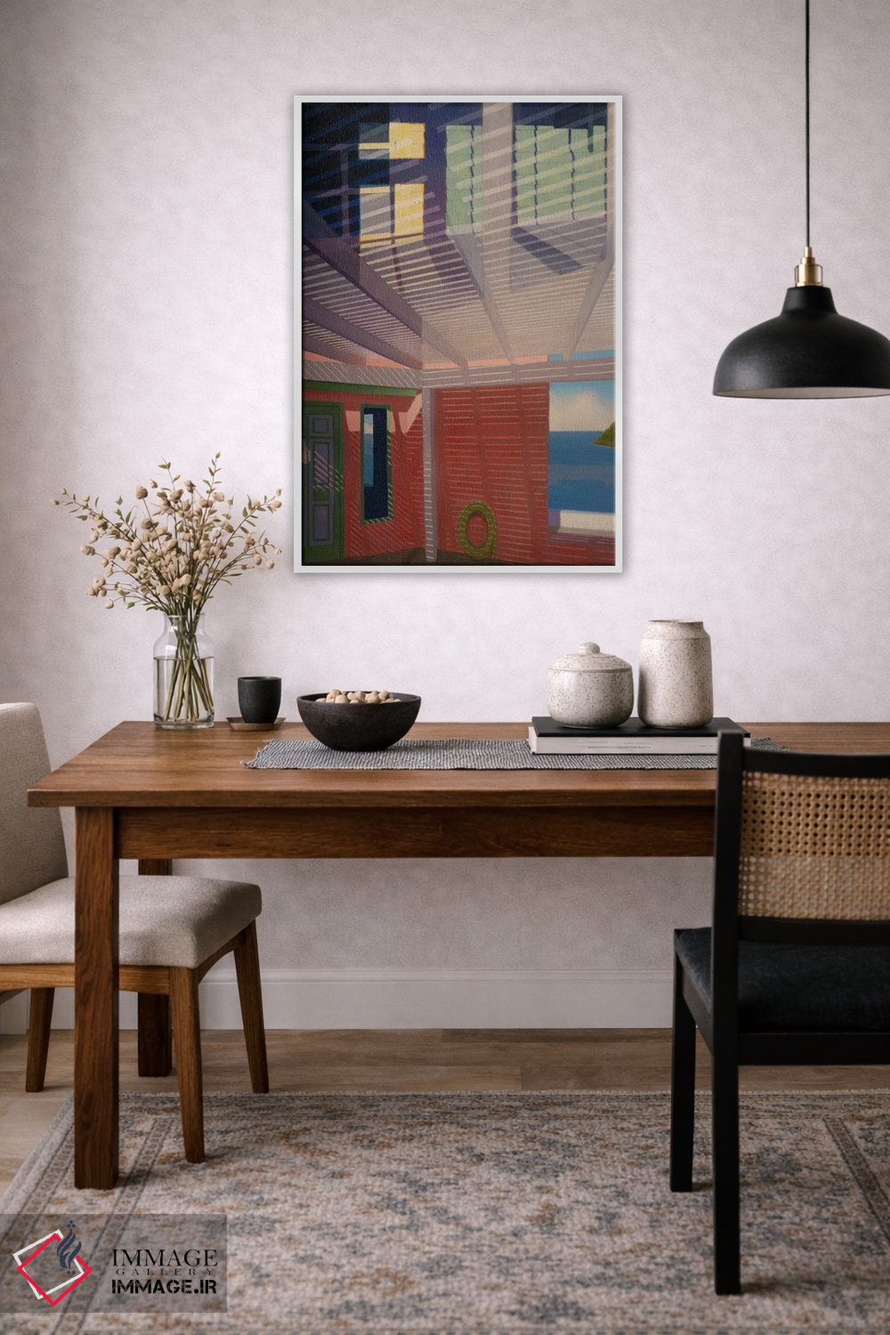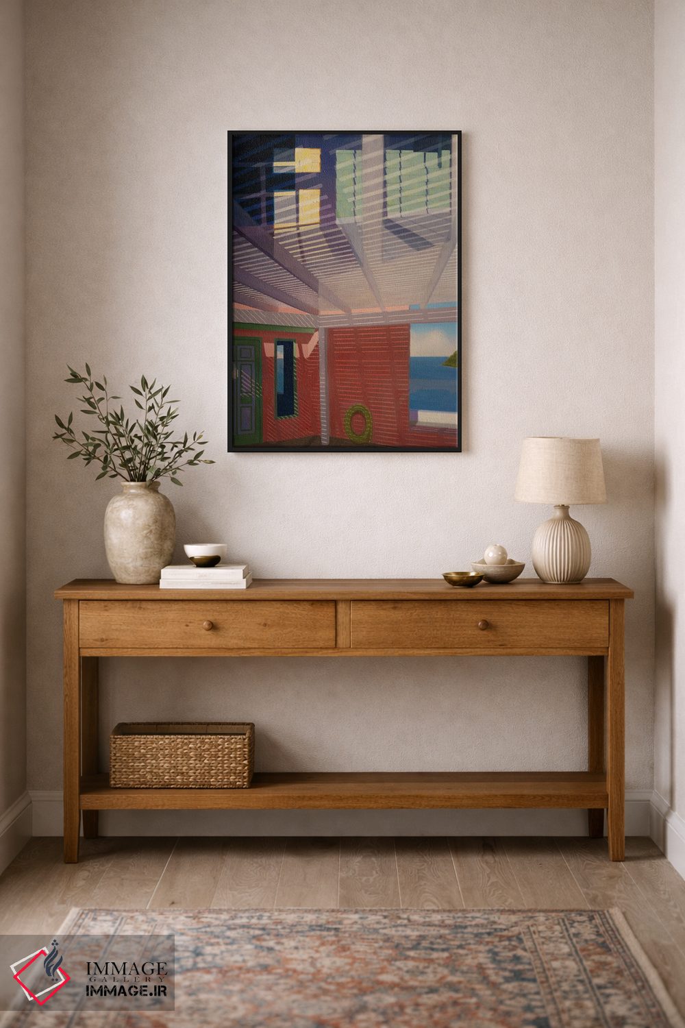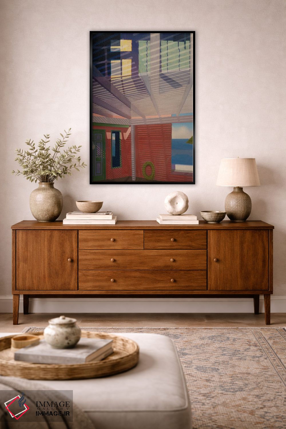 براساس پالت ترکیبی اثر، قاب تیک گرم (چوبی) پیشنهاد اول است و مشکی مات (فریم متوسط) مکمل. برای سفارشهای پروژهای با ابعاد و قابهای اختصاصی با ایماژ در تماس باشید.