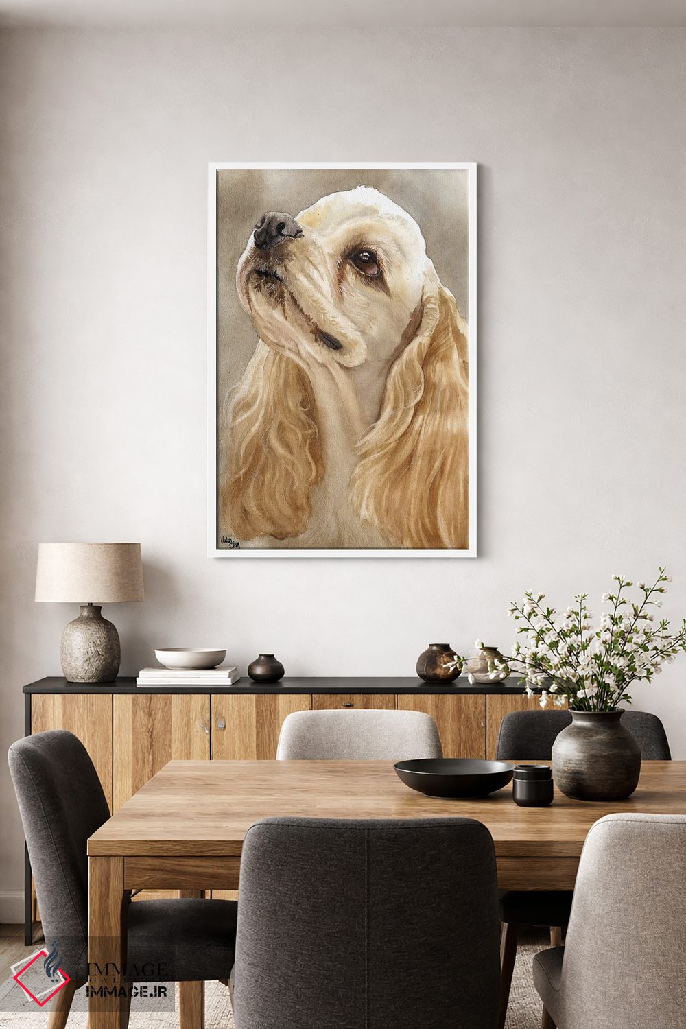براساس پالت گرم اثر، قاب بلوط روشن (چوبی) پیشنهاد اول است و استخوانی ملایم مکمل. برای سفارشهای پروژهای با ابعاد و قابهای اختصاصی با ایماژ در تماس باشید.