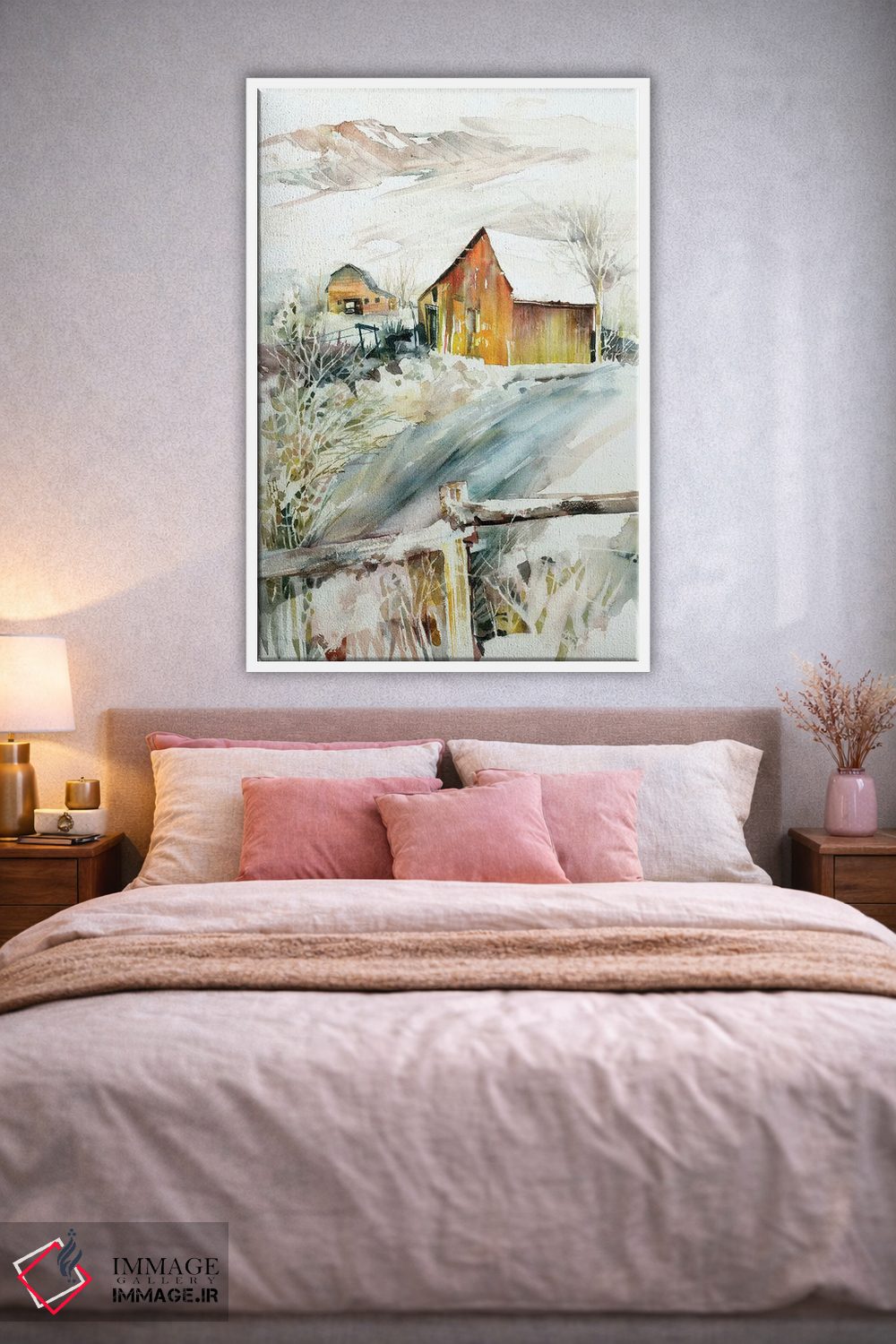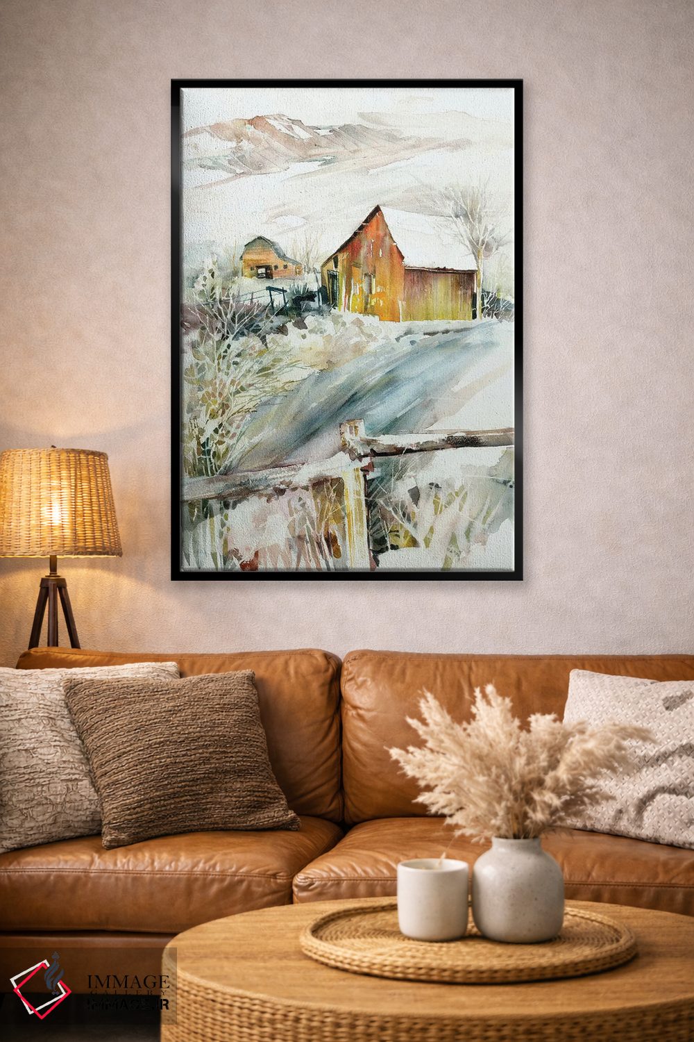 براساس پالت گرم اثر، قاب بلوط روشن (چوبی) پیشنهاد اول است و استخوانی ملایم مکمل. برای سفارشهای پروژهای با ابعاد و قابهای اختصاصی با ایماژ در تماس باشید.