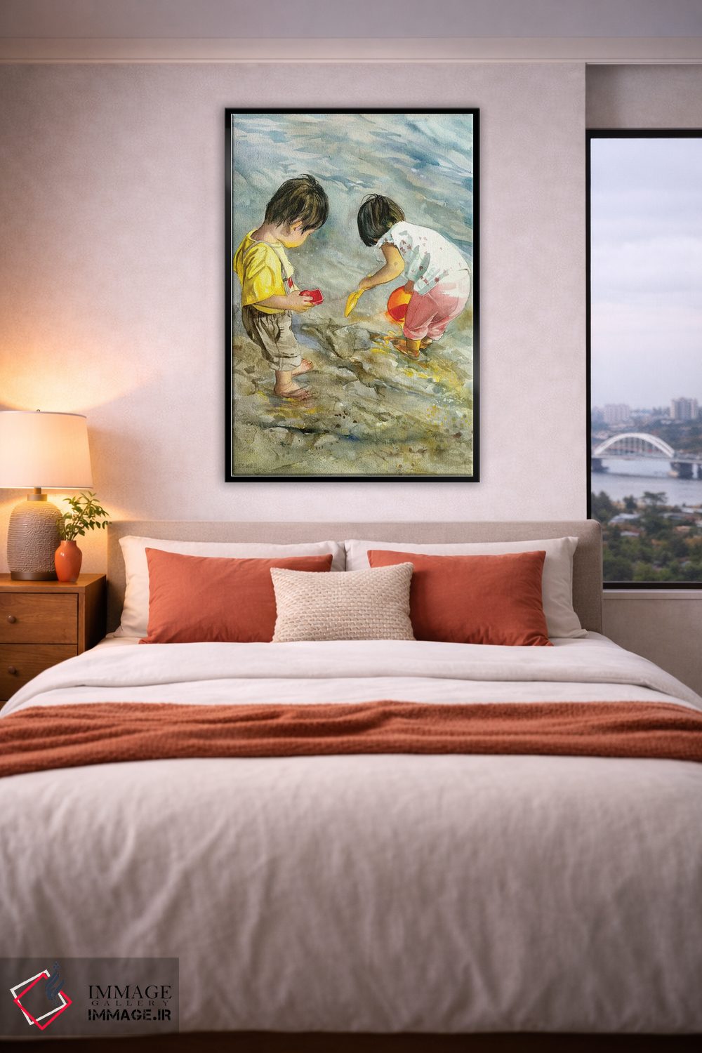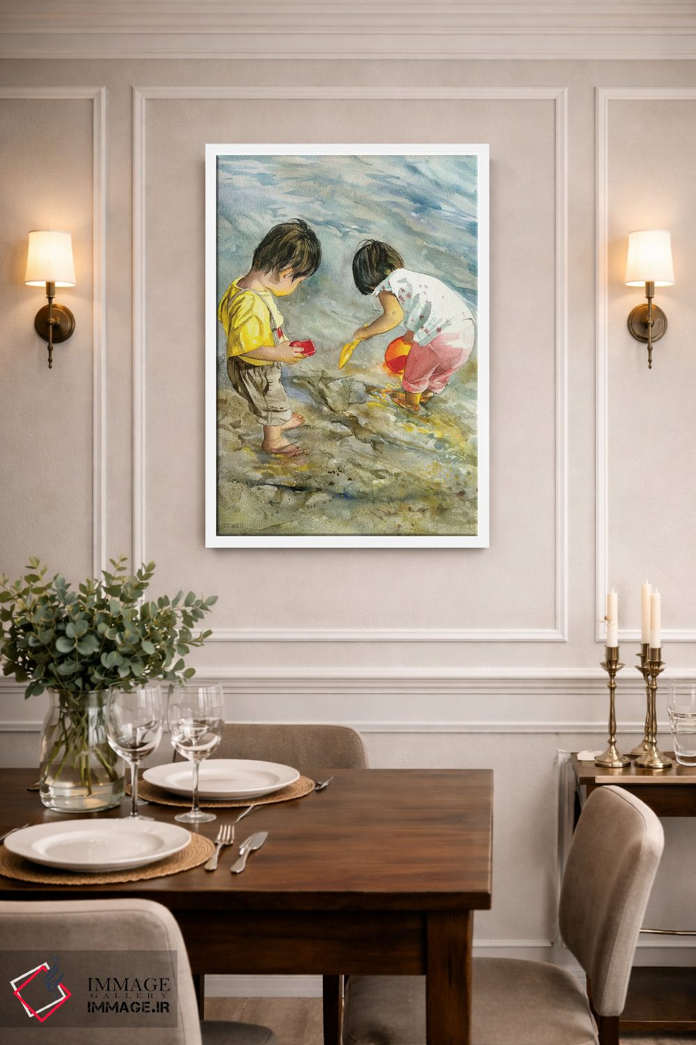 براساس پالت گرم اثر، قاب بلوط روشن (چوبی) پیشنهاد اول است و استخوانی ملایم مکمل. برای سفارشهای پروژهای با ابعاد و قابهای اختصاصی با ایماژ در تماس باشید.
