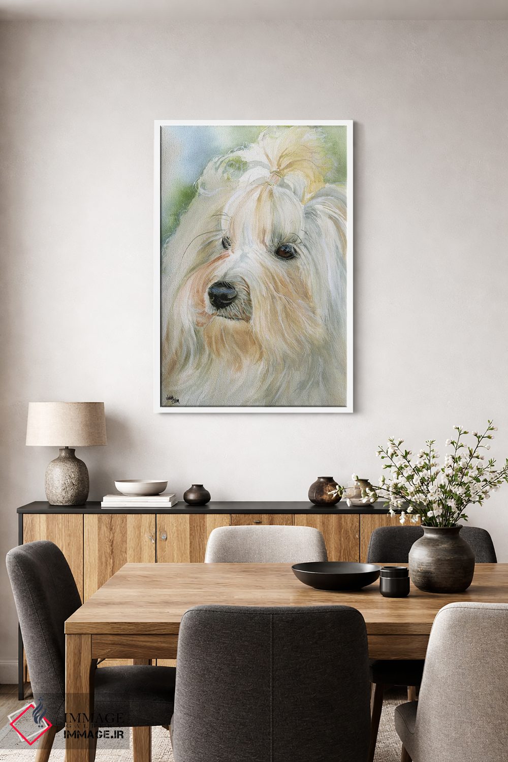 براساس پالت گرم اثر، قاب بلوط روشن (چوبی) پیشنهاد اول است و استخوانی ملایم مکمل. برای سفارشهای پروژهای با ابعاد و قابهای اختصاصی با ایماژ در تماس باشید.