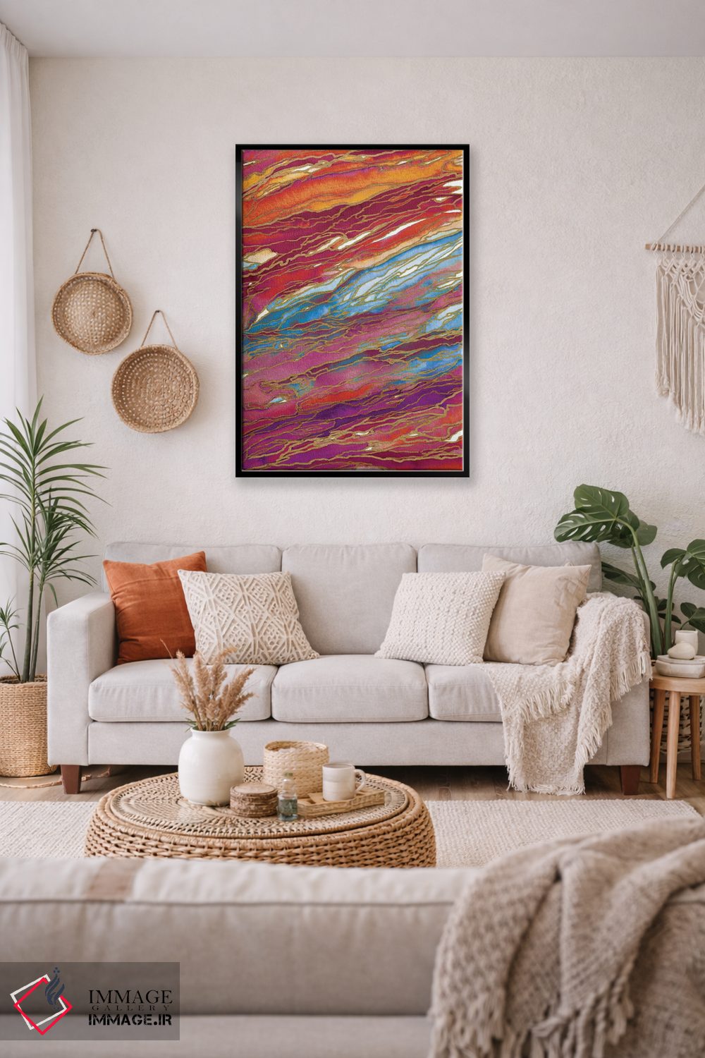 بوم گالری ایماژ نسخهی چیدماناتیوِ سطحبالا از یک اثر هنری است؛ روی کنواس بدون اسید با بافت ظریف و یکنواخت با فرآیند چاپ حرفهای جیکلی (Giclée) و کنترل دقیق تونها با رنگهای آرشیوی UltraChrome HDR برای طبیعیتر دیده شدن رنگها روی دیوار؛ روی دیوار، کار یکدستتر و خوشکیفیتتر دیده میشود.