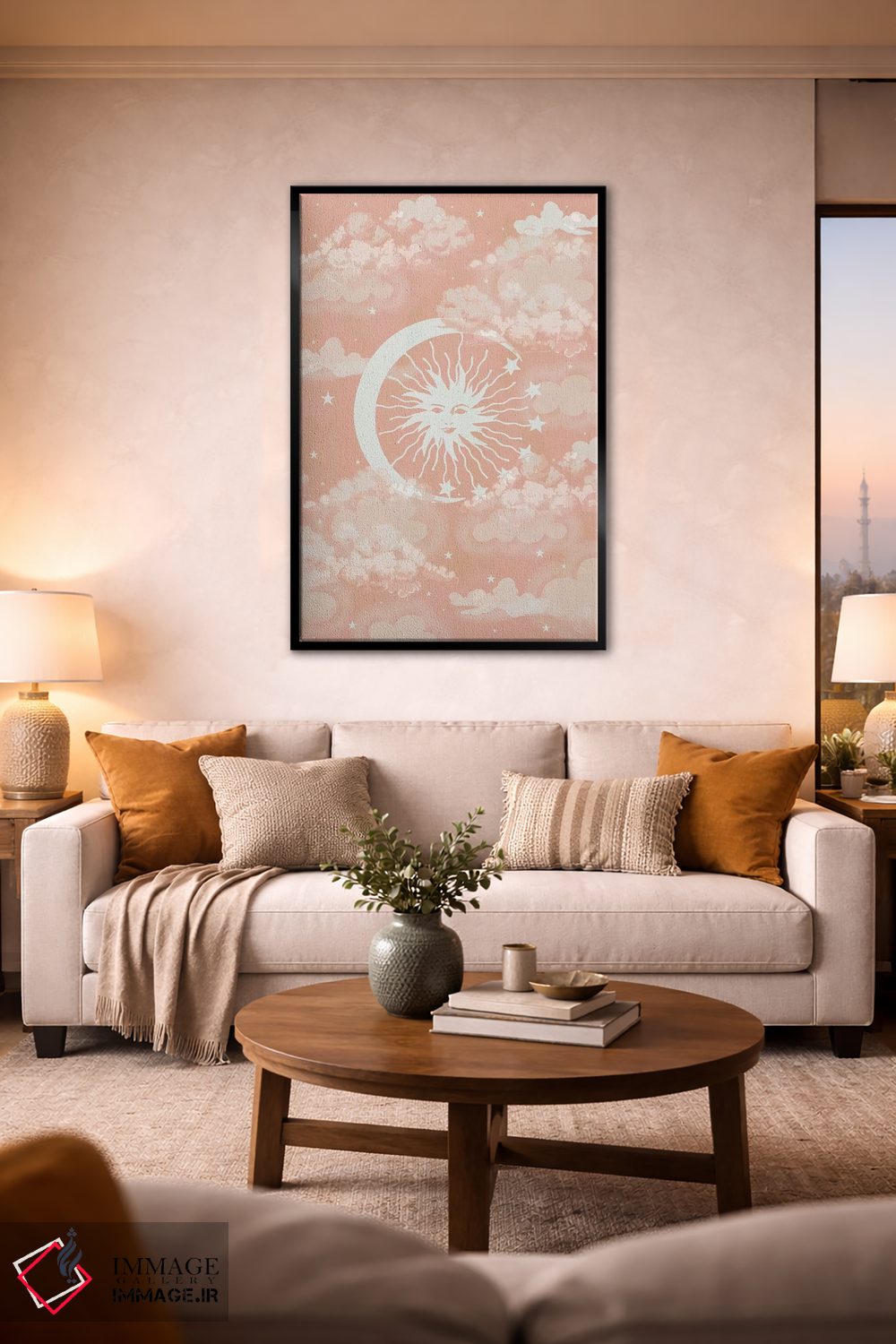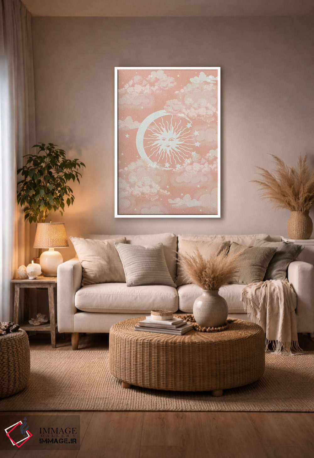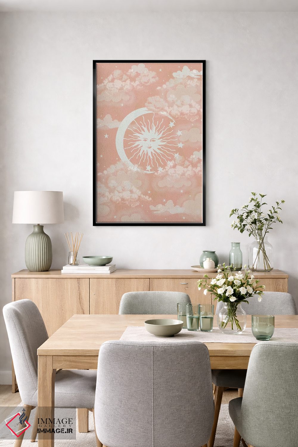 براساس پالت گرم اثر، قاب بلوط روشن (چوبی) پیشنهاد اول است و استخوانی ملایم مکمل. برای سفارشهای پروژهای با ابعاد و قابهای اختصاصی با ایماژ در تماس باشید.