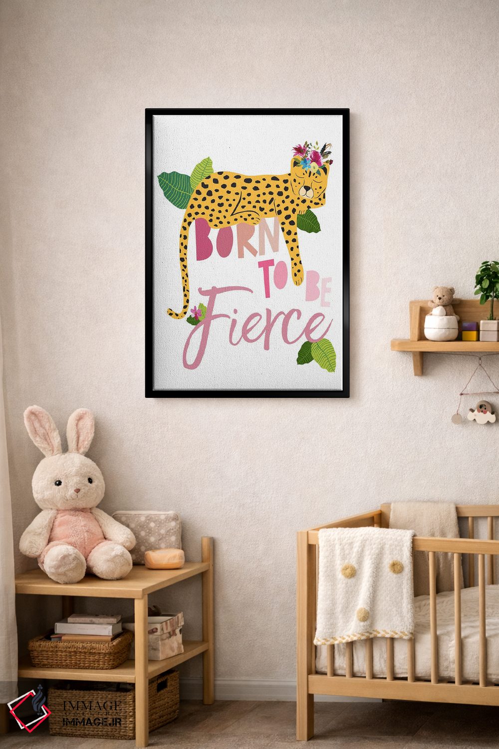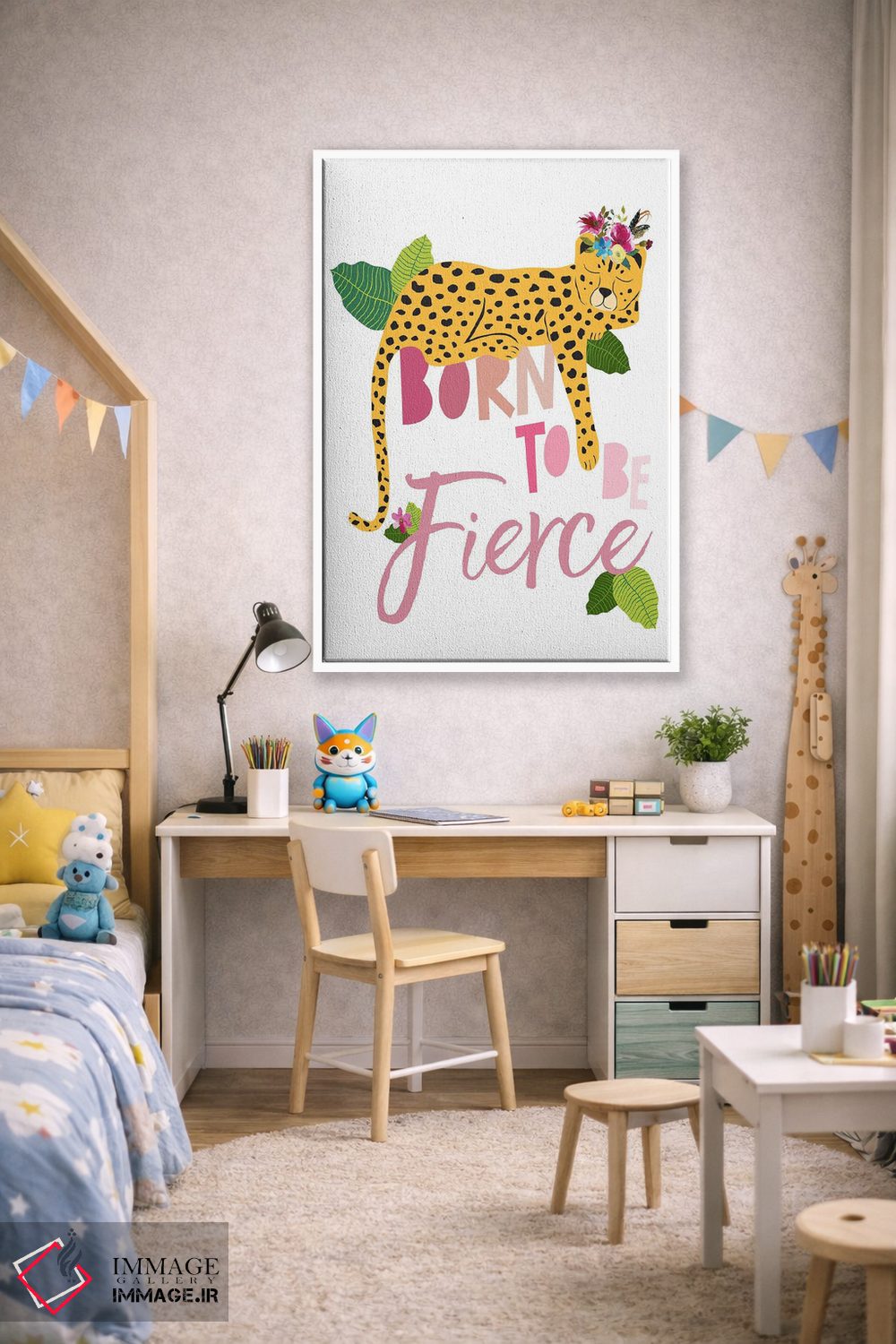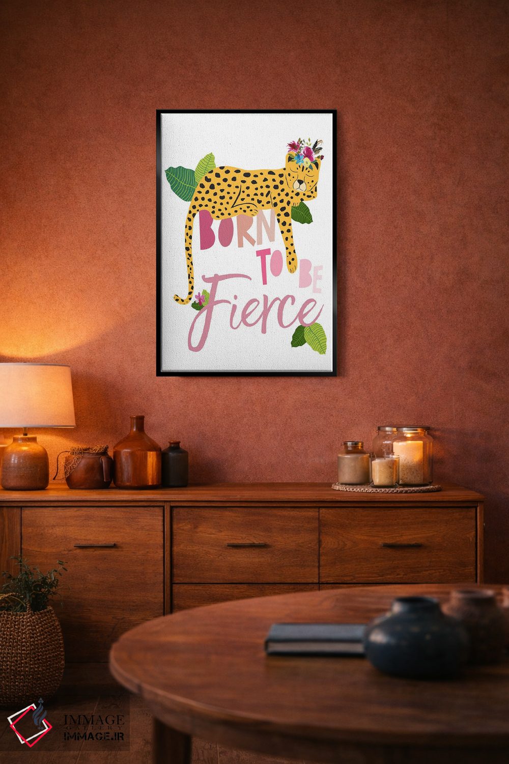 اگر میخواهید دیوار کمی سرزندگیِ محترمانه داشته باشد، «چیتای خشمگین از تولد دو» اثرِ «جنیفر مککالی» یک لبخند ریز به چیدمان میدهد، برای دیوار کنار میز کار گزینهٔ مناسبیست. هم فضا را گرم میکند، هم شلوغش نمیکند.